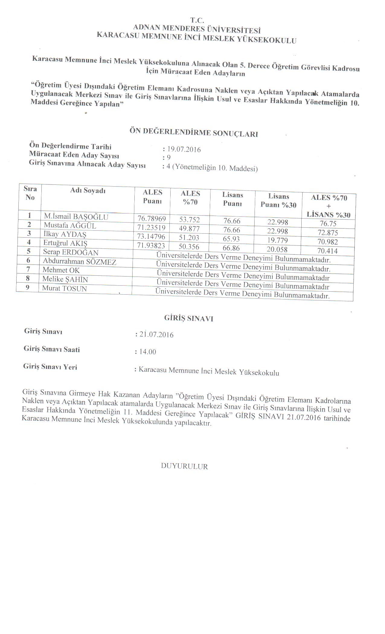 ÖĞRETİM GÖREVLİSİ KADROSU İÇİN MÜRACAAT EDEN ADAYLARIN ÖN DEĞERLENDİRME SONUÇLARI