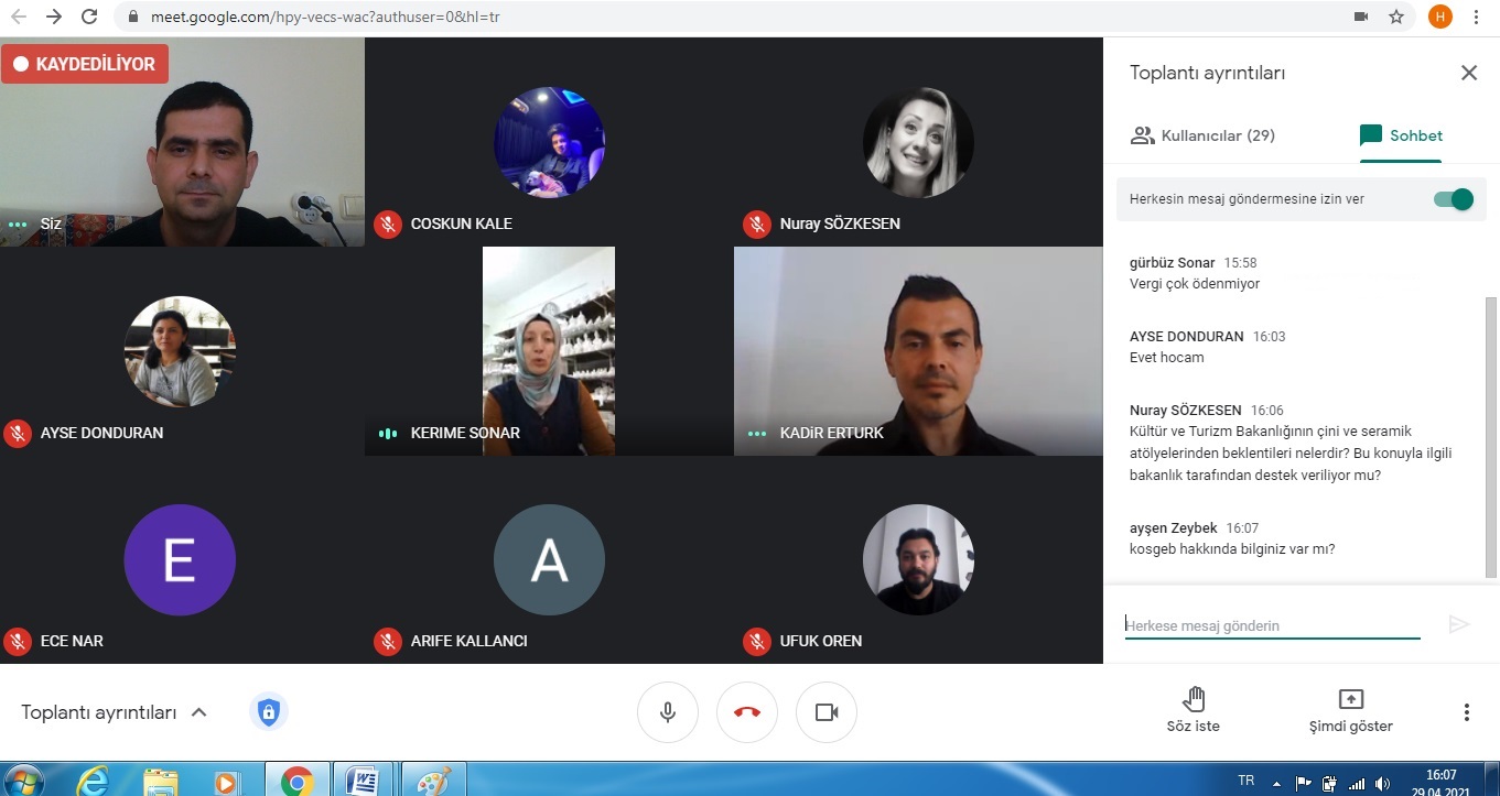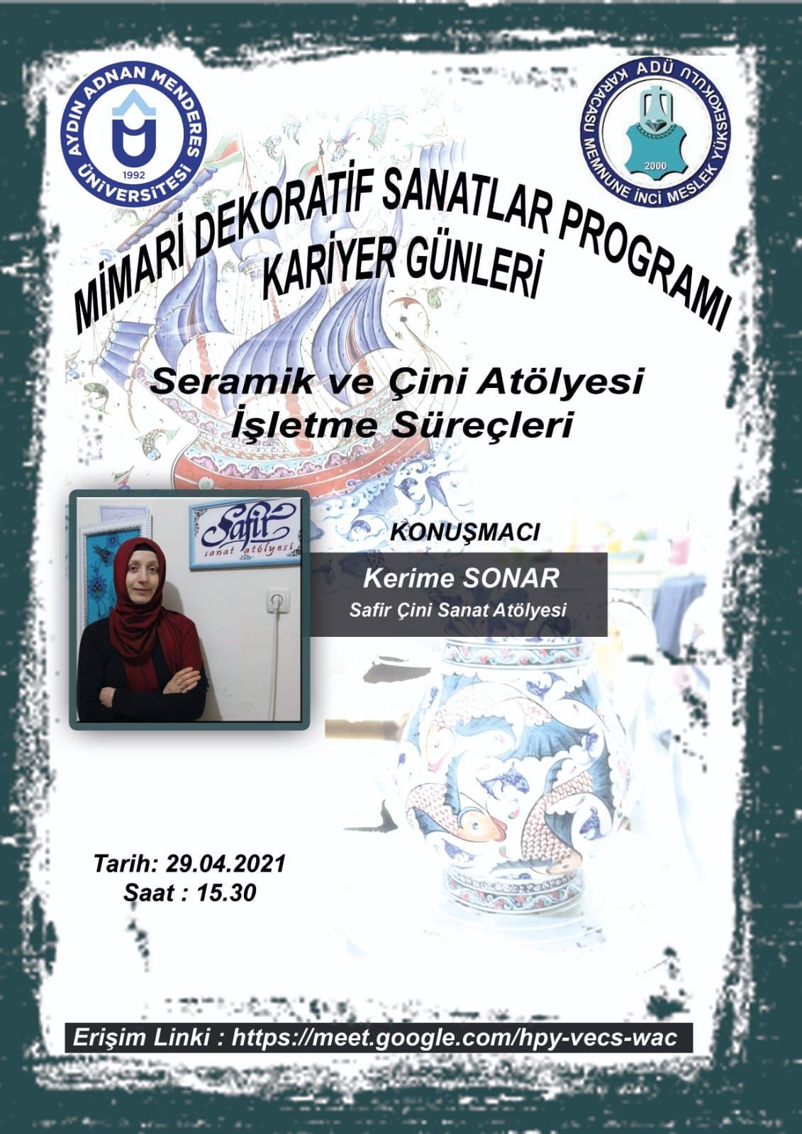 Üniversitemiz Karacasu Memnune İnci Meslek Yüksekokulu (MYO) tarafından Kariyer Günleri kapsamında düzenlenen SERAMİK VE ÇİNİ ATÖLYESİ İŞLETME SÜREÇLERİ’’ seminer, 29 Nisan 2021 tarihinde çevrimiçi olarak gerçekleÅŸtirildi. ModeratörlüÄŸünü ÖÄŸr. Gör. Halil İbrahim ÇAKIR'ın yaptığı seminerin konuÄŸu, Aydın'da iÅŸletmesi sahibi ve Çini sanatçısı Kerime SONAR oldu. Seminere Mimari Dekoratif Sanatlar 1. 2. sınıf öÄŸrencileri, mezun öÄŸrencilerimiz ve dışarıdan misafirlerimiz katıldı. Seminer seramik ve çini atölyesinin kurulumu, iÅŸletmenin iÅŸleyiÅŸi, hangi kurumlarla çalıştığı gibi çeÅŸitli konular ele alınarak yürütüldü. Mezun olan öÄŸrencilerimizin istedikleri takdirde atölye açabilmeleri ile gerekli bilgiler verildi. Seminer karşılıklı soru- cevap ÅŸeklinde son buldu.