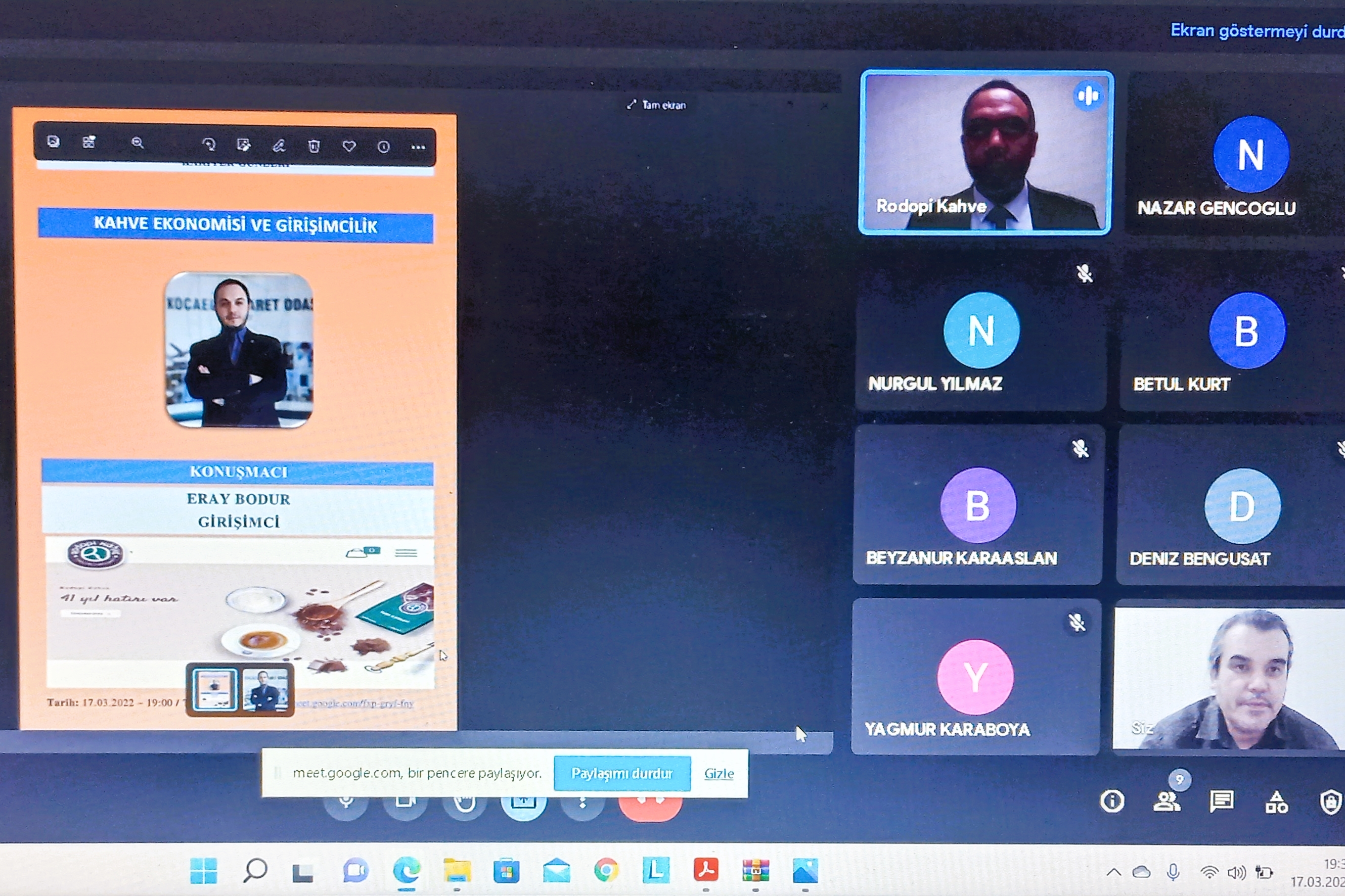 Dr.ÖÄŸr.Üyesi H. Önlem Ersöz’ün moderatörlüÄŸünü yaptığı ve Karacasu MİMYO Pazarlama Programı mezunlarından olan İş İnsanı Eray BODUR’un sunumunu yaptığı seminerde Dünya’da ve Türkiye’de kahve ekonomisi ve giriÅŸimcilik konusu tartışıldı. İş İnsanı Eray BODUR, mezuniyeti sonrasında kahve dünyasına adımını attığını ve kahvenin kariyerinin dönüm noktasını oluÅŸturduÄŸunu söyledi. Eray BODUR, kahve sektörünün Dünya’da petrolden sonra ikinci sırada gelmesinin kendisini motive ettiÄŸini; bu amaçla İzmit’te Rodopi Kahve adıyla kendi markasını kurduÄŸunu aktardı. İş fikrini hayata geçirirken yaÅŸadığı deneyimleri öÄŸrencilerle paylaÅŸan Eray BODUR, iÅŸ dünyasındaki paydaÅŸların önemine dikkat çekti. Çalışacakları sektörlerde baÅŸarılı olabilmek için öncelikle bilgi sahibi olmak ve çok çalışmak gerektiÄŸini; giriÅŸimcinin sektördeki dernek, vakıf ve ticaret odalarıyla iliÅŸkileri güçlendirmesinin de iÅŸ dünyasındaki fırsatları görme ve yorumlayabilme yeteneklerini arttırdığını açıkladı. Seminerde iÅŸ dünyasında baÅŸarılı olmak için gerçekçi hedefler belirlemenin ve denemekten asla vazgeçmemenin gerektiÄŸi vurgulandı. Seminer karşılıklı soru-cevap bölümünün ardından sona erdi.