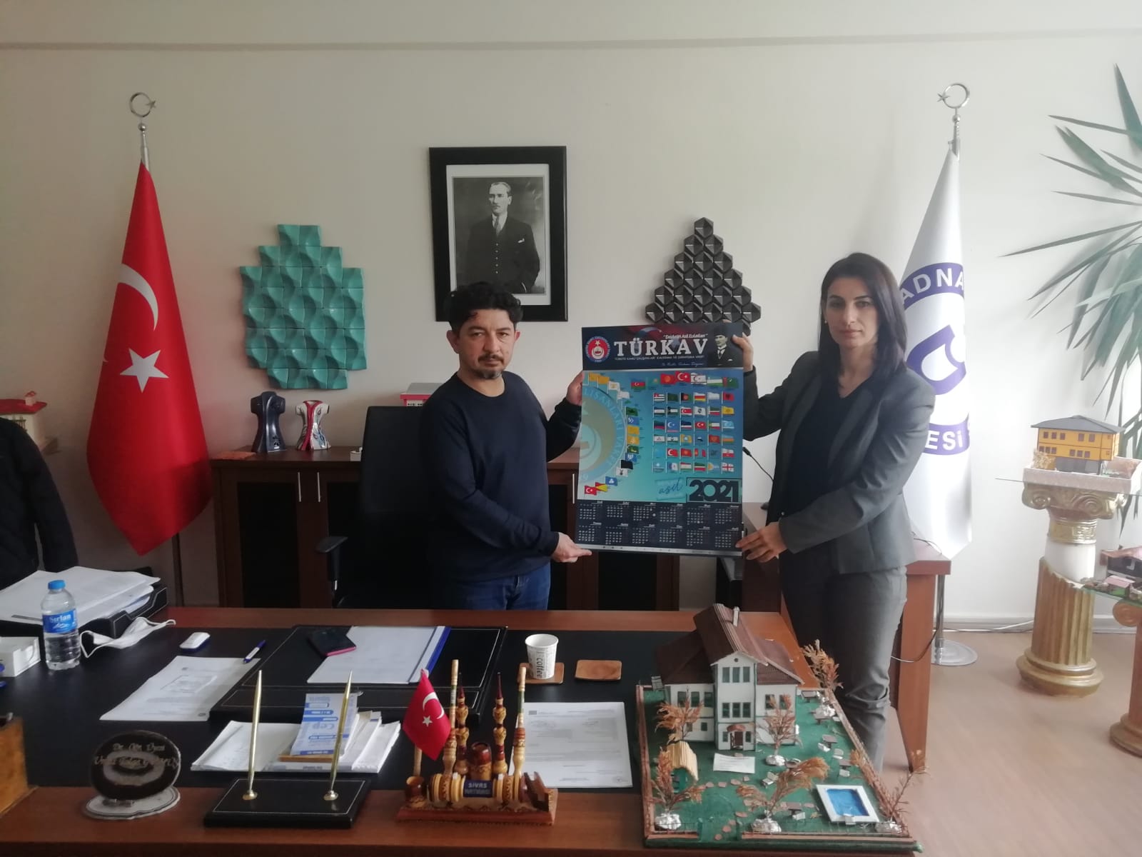 23 Şubat 1989 tarihinde merhum başbuğ Alparslan Türkeş'in destek ve iradeleriyle kurulan Türkiye Kamu Çalışanları Kalkınma ve Dayanışma Vakfı (Türkav) Aydın Şube Başkanı Sn. Gülşah Kale ve yönetim kurulunun değerli üyeleri Adnan Menderes Üniversitesi, Karacasu Memnune İnci Meslek Yüksekokulu müdürü Dr. Öğrt. Üyesi Umut Tolga GÜMÜŞ'ü makamında ziyaret etmişlerdir. Yeni görevi devralan Türkav Aydın Şubesi Başkanı Sn. Gülşah KALE, vakfın çalışmaları ve hedefleri hakkında yüksekokulu müdürü ile istişarede bulunmuşlardır. Ziyaretlerinde Başkan Gülşah, yüksekokul müdürüne vakfın 2021 yılı takvimini takdim etmiş, ayrıca Dr. Umut Tolga GÜMÜŞ'ün üyelik kaydını da almışlardır. Yüksekokul müdürünün danışmanlığını yaptığı Türk Dünyası Araştırmaları Topluluğu ile ileride Türk gençliğinin yetişmesi açısından yapılabilecek çalışmalar üzerinde durulmuştur. Ziyaret esnasında Başkan KALE, okulun atölyelerini de gezmiş, yapılan çalışmaları çok beğendiğini ifade etmiştir. Gün içerisinde yüksekokul müdürü ile birlikte Başkan KALE, Karacasu Belediye Başkanı Sayın Zeki İNAL'ı da makamında ziyaret etmişler ve belediye ile meslek yüksekokulunun koordineli çalışmalarından dolayı memnuniyetlerini dile getirmişlerdir. son olarak Belediye başkanımız ve yüksek okul müdürümüz yapılan bu ziyaretten duydukları memnuniyeti dile getirmişler ve en kısa sürede Aydın şubesinde de ziyaret edeceklerini belirtmişlerdir.