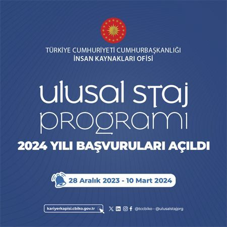 Cumhurbaşkanlığı İnsan Kaynakları Ofisi koordinasyonunda, tüm kamu kurumları ve özel sektörden gönüllü işverenlerin katılımı ile yükseköğretimde sürdürülen Ulusal Staj Programı 2024 yılı başvuruları başlamış olup, 10 Mart 2024 tarihine kadar devam edecektir.