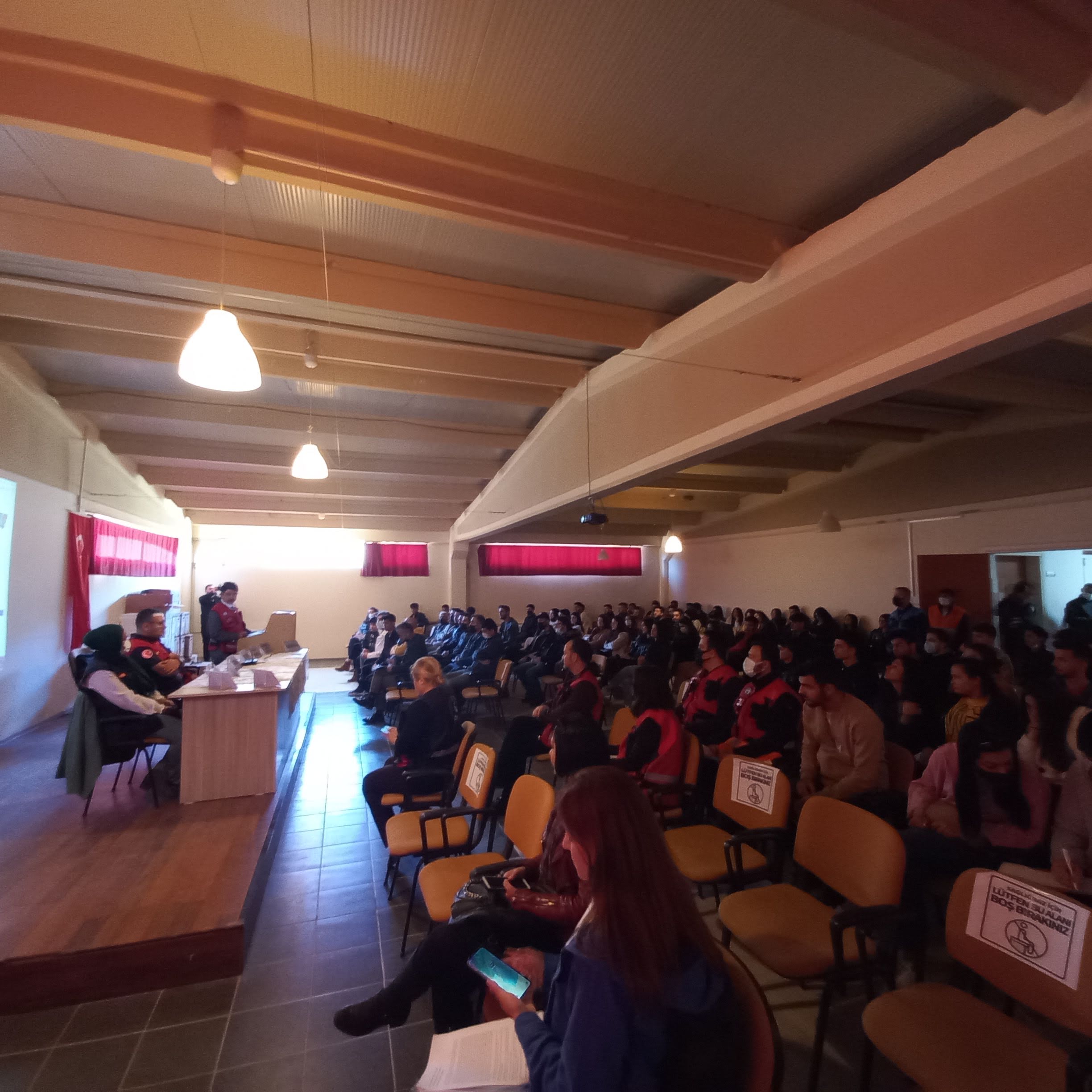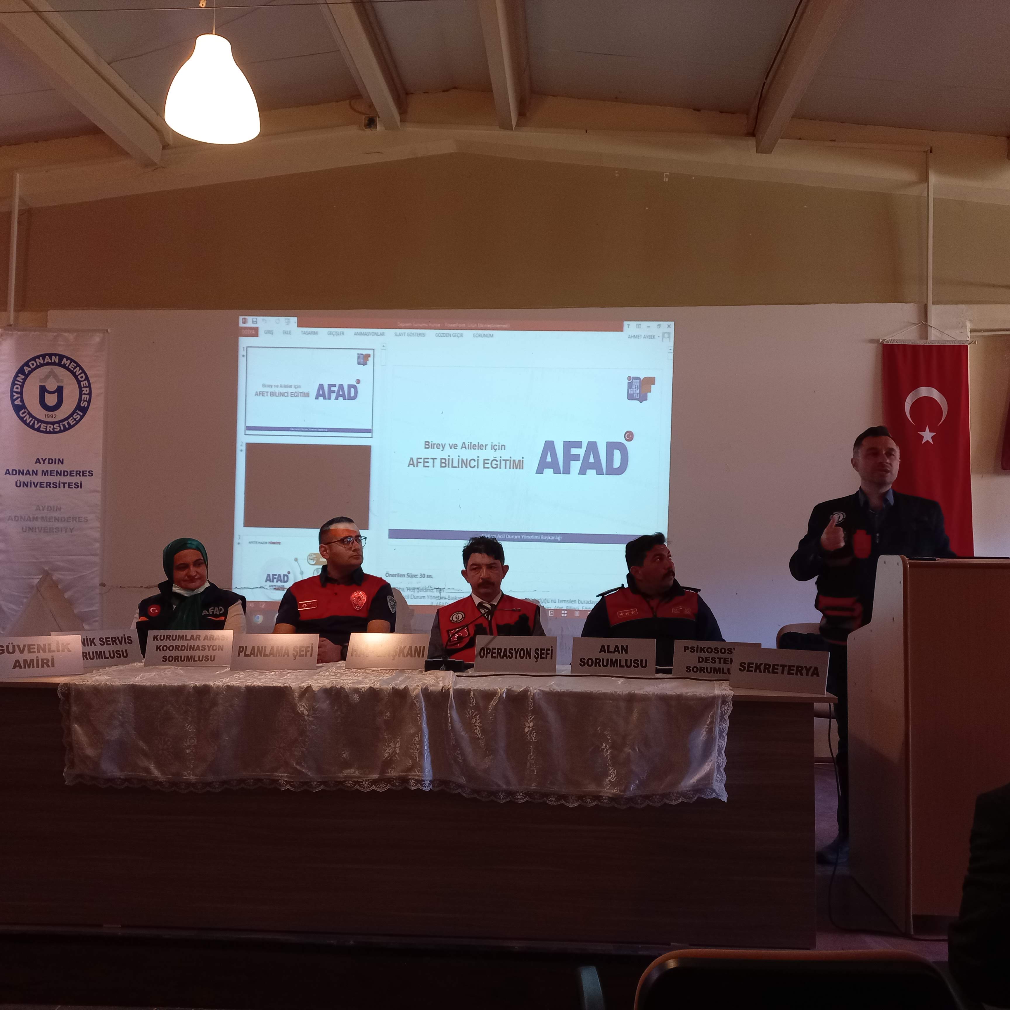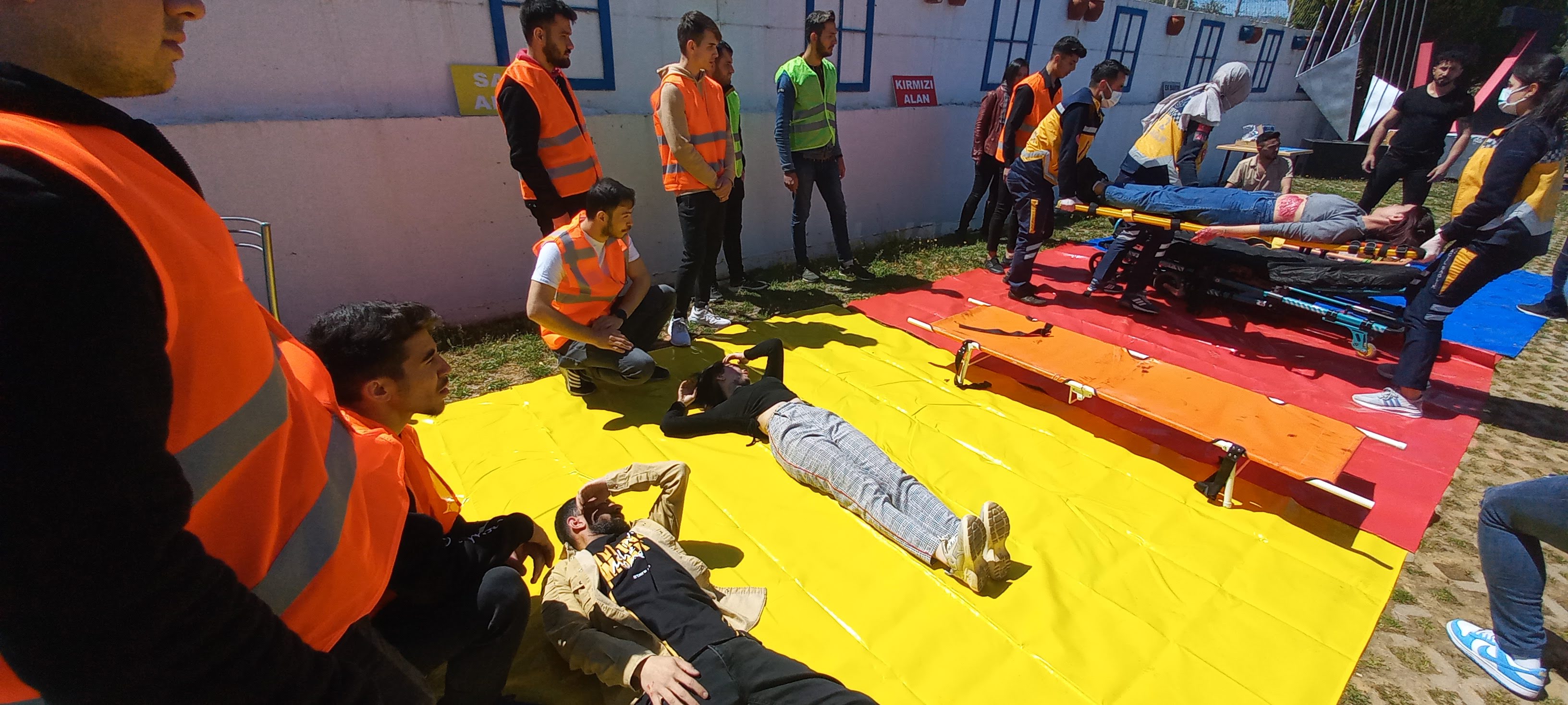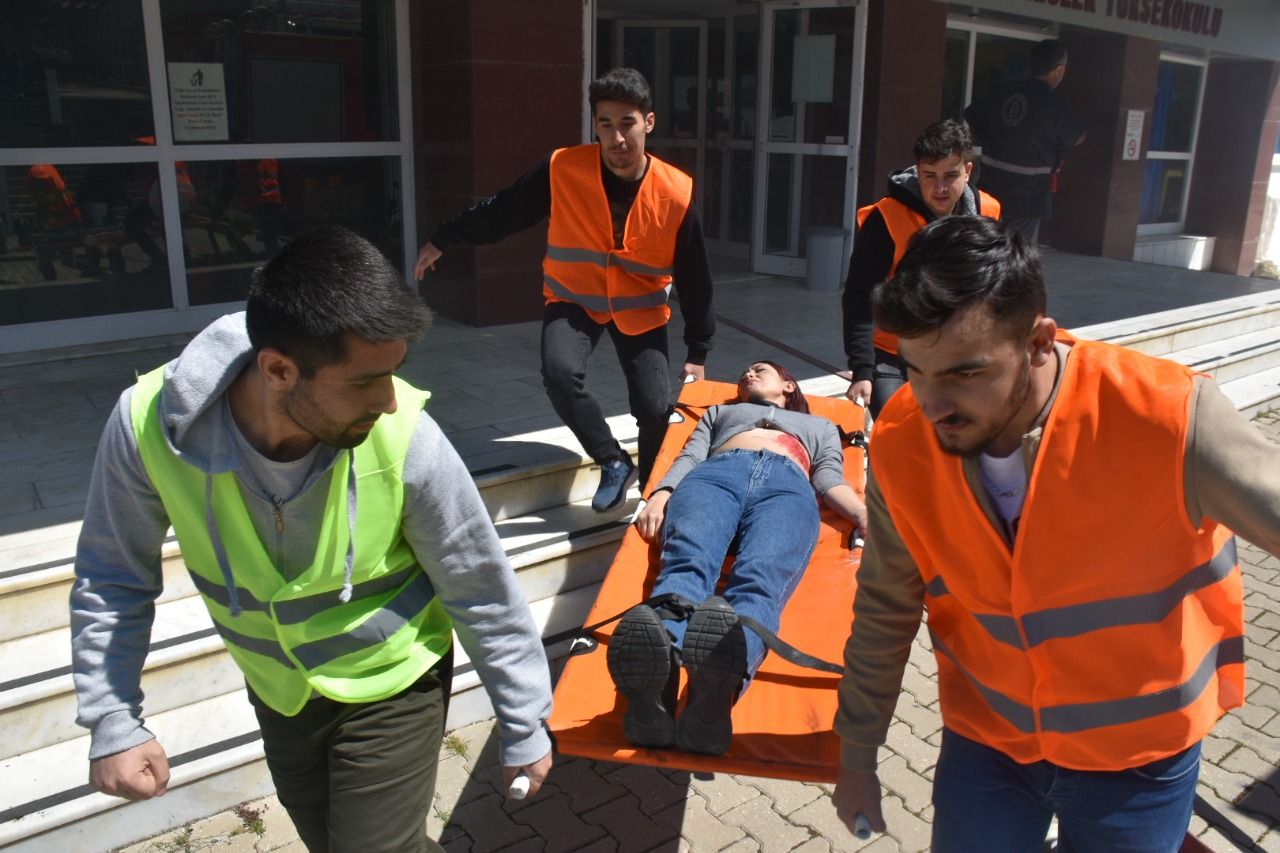 Acil durum tatbikatı kapsamında ADÜ Ä°SG birimi, Sivil Savunma Uzmanlığı, İtfaiye, AFAD, 112 Acil Ambulans hizmetleri ve Aydın İl Emniyet MüdürlüÄŸü Bomba İmha Büro AmirliÄŸi iÅŸ birliÄŸi ile yangın, tahliye ve bomba imha tatbikatı yapıldı. Farklı birimlerden 25 kiÅŸilik ekiple birlikte, Yüksekokul Müdürü Dr. ÖÄŸr. Üyesi Umut Tolga GÜMÜÅž, öÄŸretim elamanları, 150 İş SaÄŸlığı ve GüvenliÄŸi Programı öÄŸrencisi ve 10 idari personelin katıldığı tatbikatlarda senaryoya baÄŸlı kalınarak yangın söndürme, yaralıları kurtarma ve bomba imha iÅŸlemi gerçekleÅŸtirildi. Sabah masa başı tatbikatla öÄŸrencilere yangın ve deprem anında yapılması gerekenler anlatıldı. Ayrıca İşyeri SaÄŸlığı ve GüvenliÄŸi Birimi tarafından İş SaÄŸlığı GüvenliÄŸi ve acil durumlar hakkında bilgilendirme yapıldı. Afet ve Acil Durum BaÅŸkanlığı tarafından yangın ve afet konuları hakkında bilgi verildi. ÖÄŸleden sonra gerçekleÅŸtirilen yangın ve ÅŸüpheli paketi içeren tatbikat hareketli anlara sahne oldu. Senaryo gereÄŸi elektrik panosunda çıkan yangınla baÅŸlayan tatbikatta itfaiye ve AFAD ekiplerinin olay yerine gelmesi, yangına müdahale edilmesi ve yaralıların kurtarılması iÅŸlemleri gerçekleÅŸtirildi.