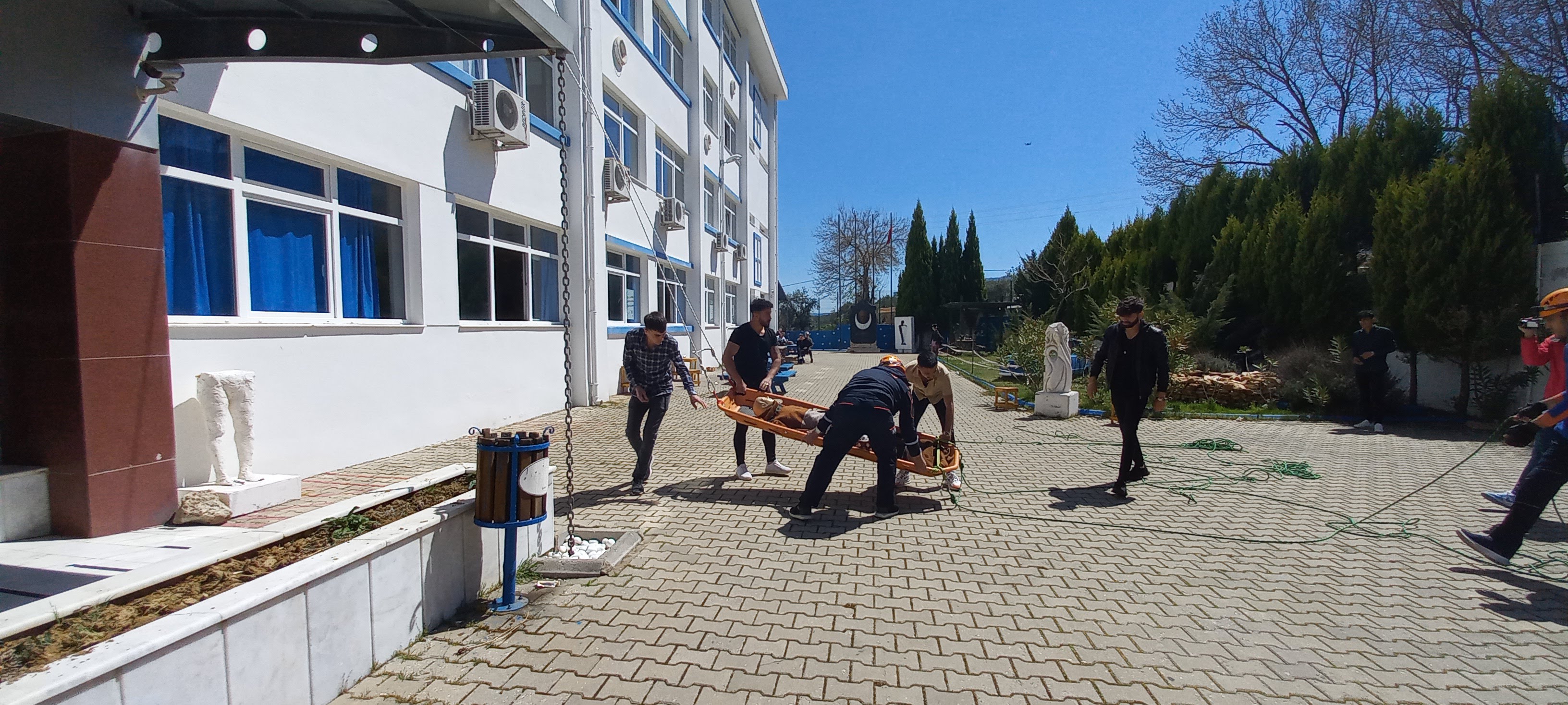 AFAD tarafından okulun üst katında kalan bir yaralı halatlar yardımıyla kurtarıldı. Yaralılar 112 ekipleri tarafından hastaneye sevk edildi. Yangın tatbikatının ardından bomba imha iÅŸlemine geçildi. Okulda tespit edilen ÅŸüpheli bir paket uzaktan kontrollü bomba imha robotu tarafından okuldan çıkarılarak boÅŸ bir alana götürüldü. Bomba imha uzmanı tarafından ÅŸüpheli pakete fünye yerleÅŸtirildi. YerleÅŸtirilen fünye kontrollü bir ÅŸekilde patlatıldı. Bu iÅŸlemin ardından Aydın BüyükÅŸehir Belediyesi İtfaiye ekipleri olası bir yangında nasıl davranılması gerektiÄŸi ve söndürme iÅŸleminin nasıl yapılması gerektiÄŸi hakkında bilgi verdi. ÖÄŸrenciler ve öÄŸretim görevlileri yangın söndürme tüpünü kullanıp alevlere müdahalede bulundu. Oldukça baÅŸarılı geçen etkinlik sonunda öÄŸrenciler ve öÄŸretim görevlileri memnuniyetini dile getirdi. Yangın sırasında senaryo gereÄŸi yaralı rolü yapan öÄŸrencilerin gerçeÄŸini aratmayan makyajlarının Okul Mimari Restorasyon bölümü öÄŸrencilerince gerçekleÅŸtirildiÄŸi bilgisi verildi. Yangın tatbikatı sırasında senaryo gereÄŸi basın mensubu olan öÄŸrenciler görevlilerce alandan uzaklaÅŸtırılmaya çalışıldı.