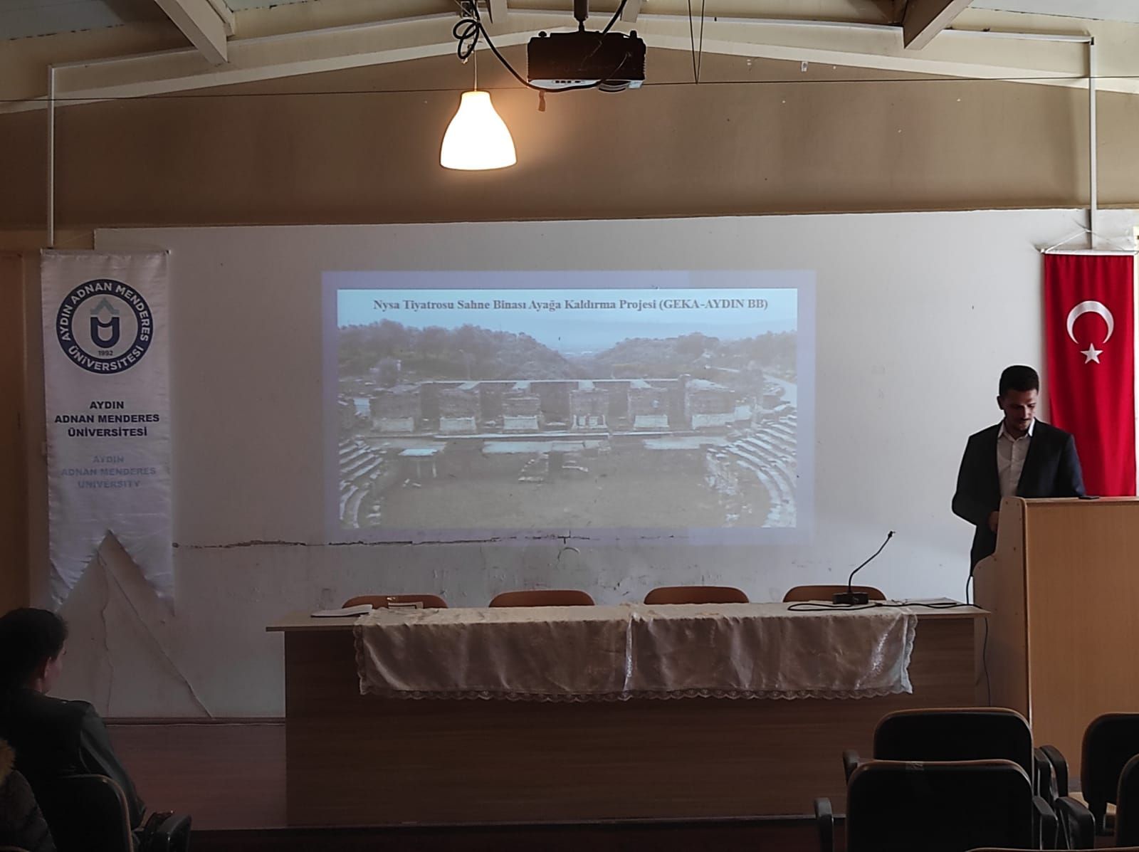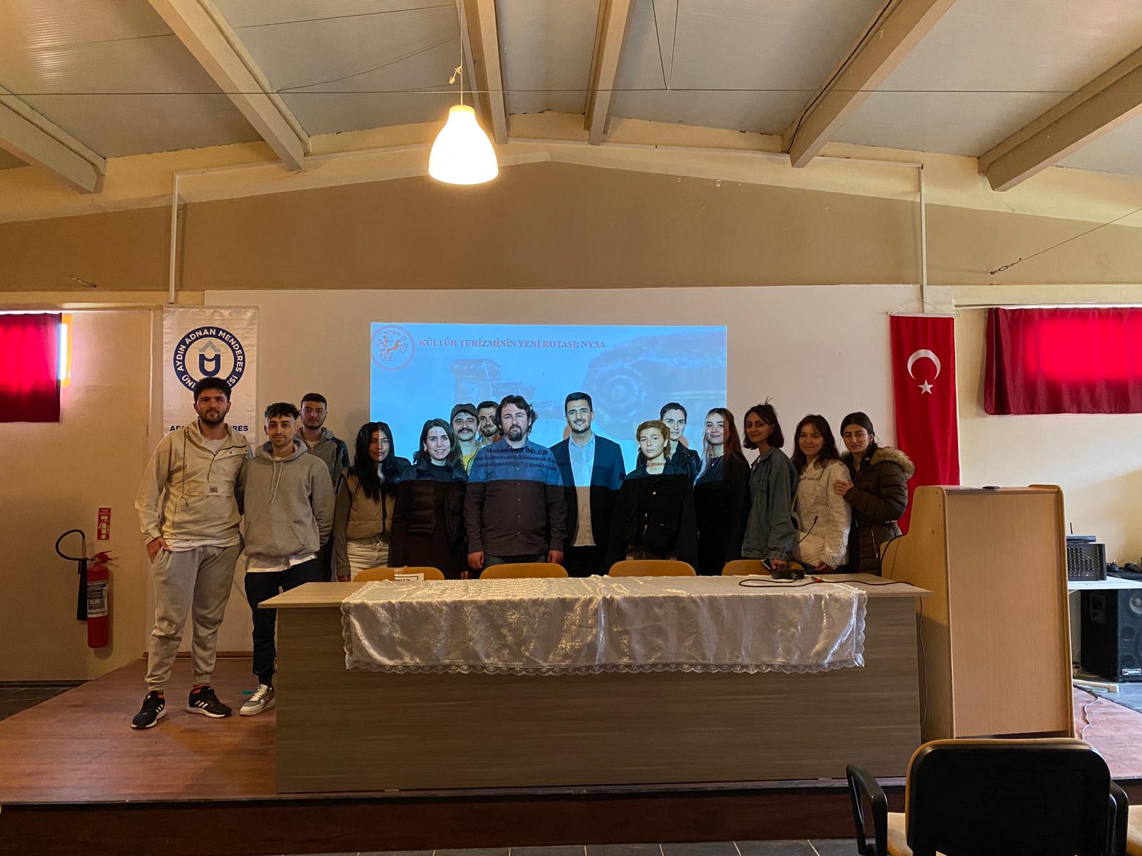 Nysa antik kentinde görevli Uzman Konservatör-Restoratör Muhammed DİLER’in konuÅŸmacı olarak katıldığı etkinlikte, Mimari Restorasyon ve Turizm programı öÄŸrencileri ÖÄŸretim Üyesi Dr. Esra AKSOY ve ÖÄŸr. Gör. Dr. İsmail Mert ÖZDEMİR ile birlikte hazır bulundu.