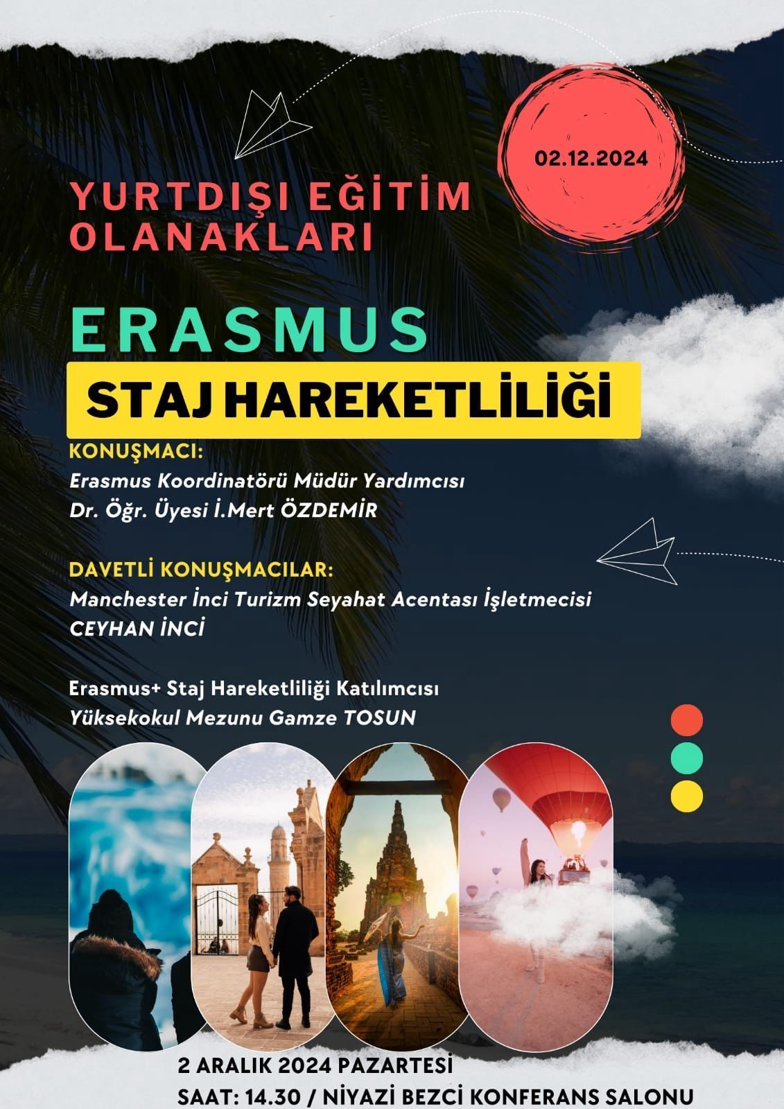 EÄŸitimde konuÅŸmacı ve moderatör olarak Yüksekokul Müdür Yardımcımız Dr. ÖÄŸr. Üyesi İ. Mert Özdemir, davetli konuÅŸmacı olarak Manchester İnci Turizm Seyahat Acentası İşletmecisi Ceyhan İnci ve Erasmus+Staj HareketliliÄŸi Katılımcısı olarak Yüksekokul mezunlarımızdan Gamze Tosun yer alacaktır.