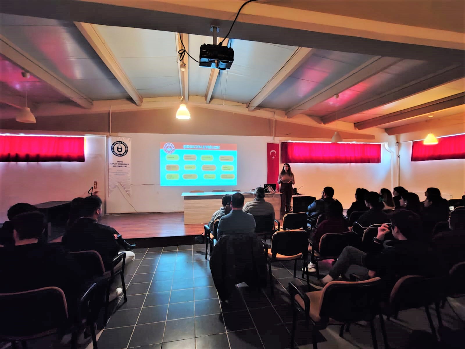 Müdür yardımcısı Dr. Öğr. Üyesi Esra Aksoy, akademik personelimiz ve tüm öğrencilerimizin katılımı ile gerçekleşen konferansta; KADES uygulaması, Şiddet Türleri, Şiddetin Etkileri ve Yasal Düzenlemeler hakkında bilgi verildi.