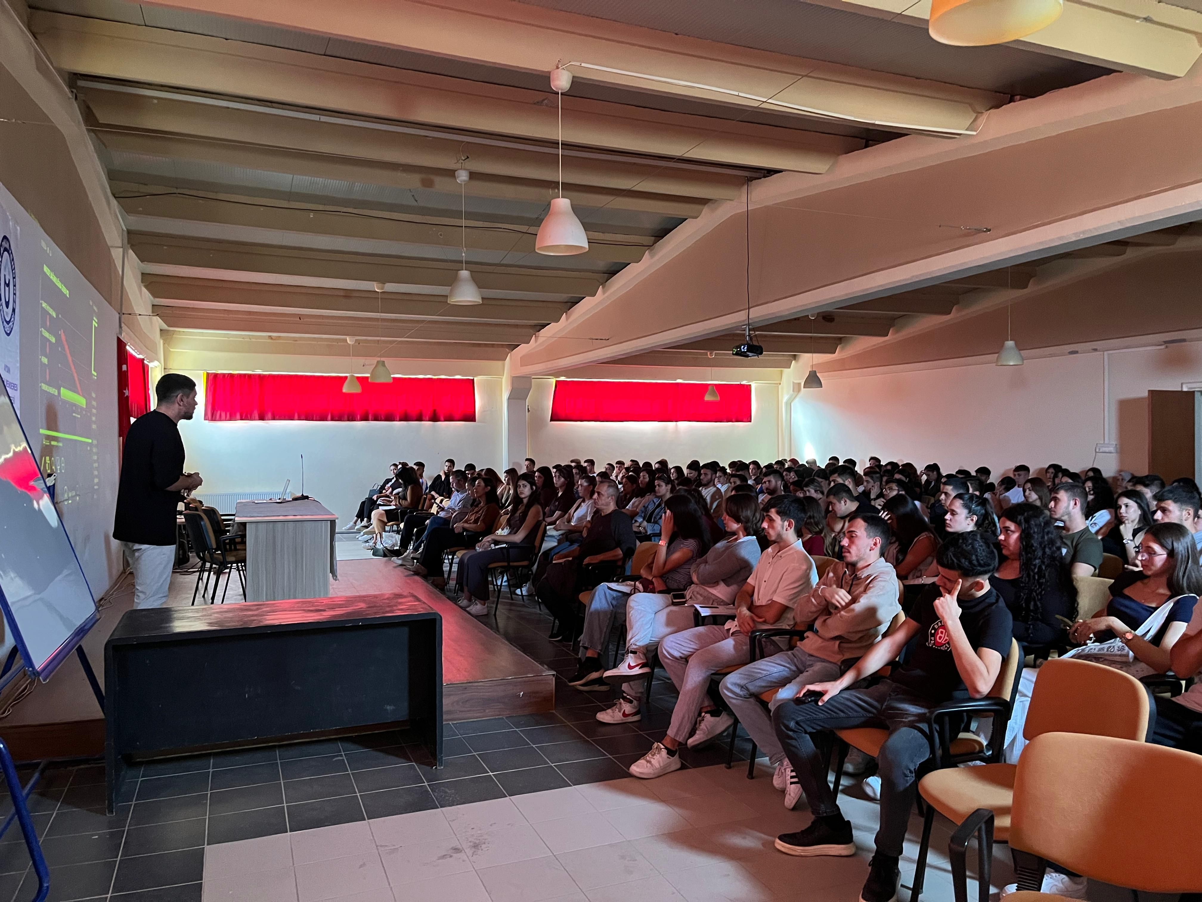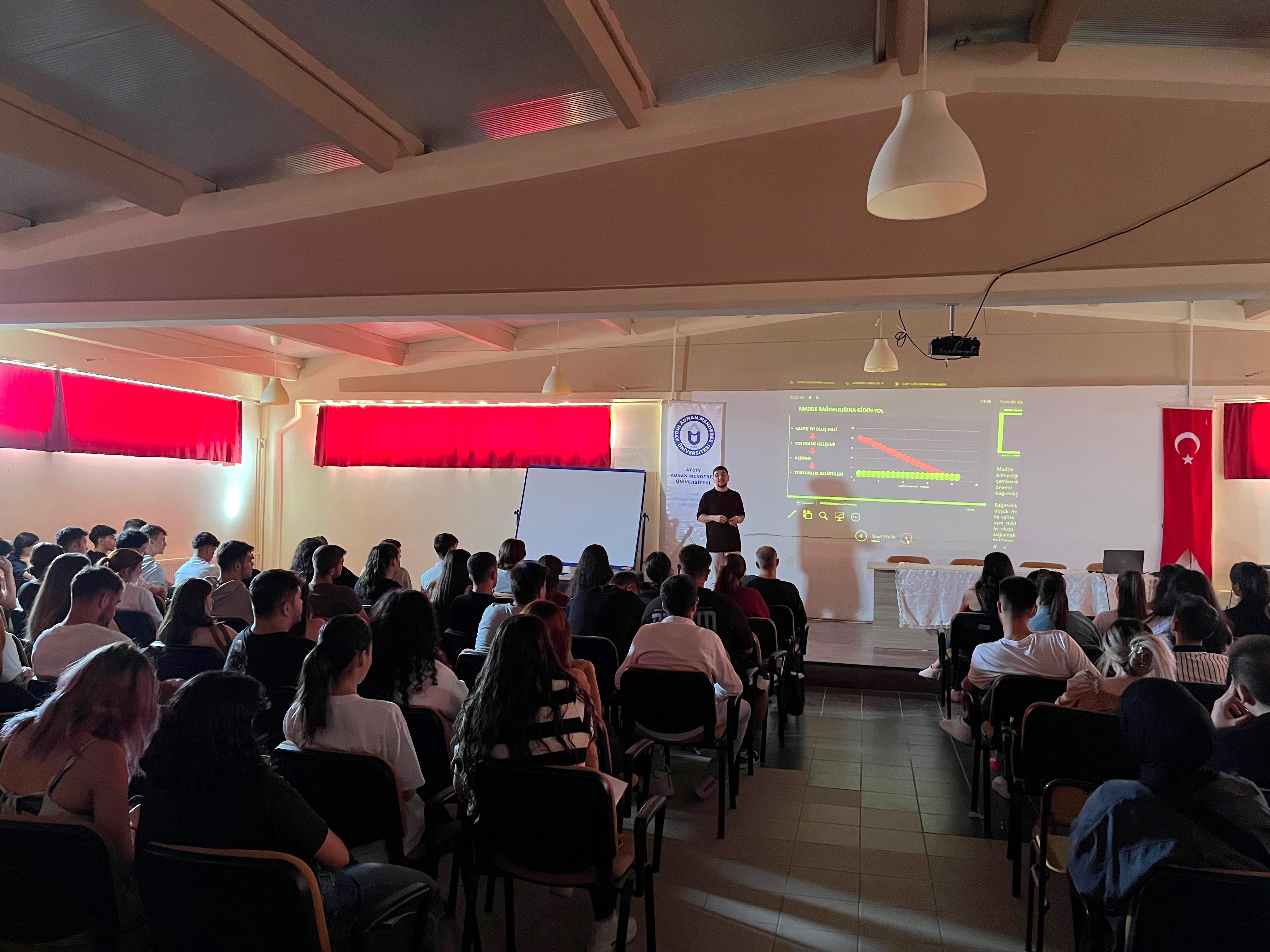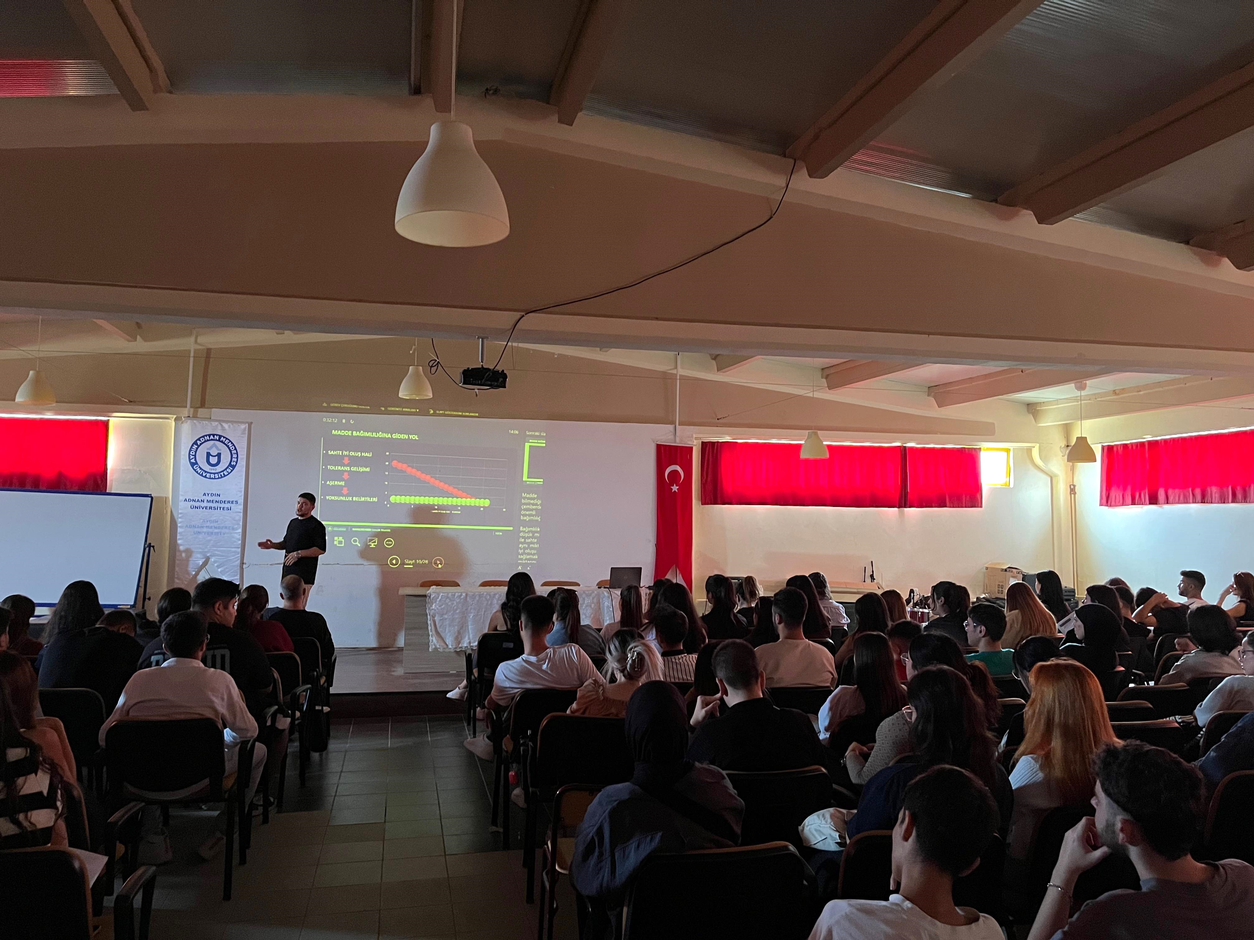 250 öğrencimizin katılımı ile gerçekleştirilen eğitimde, Nazilli Narkotik Şube Büro Amirliği’nde görevli Komiser Furkan KARADAŞ Yüksekokul öğrencilerine, uyuşturucu madde bağımlılığı, bağımlılık döngüsü ve bağımlılıkla mücadelede yapılması gerekenler hakkında bilgi verdi.