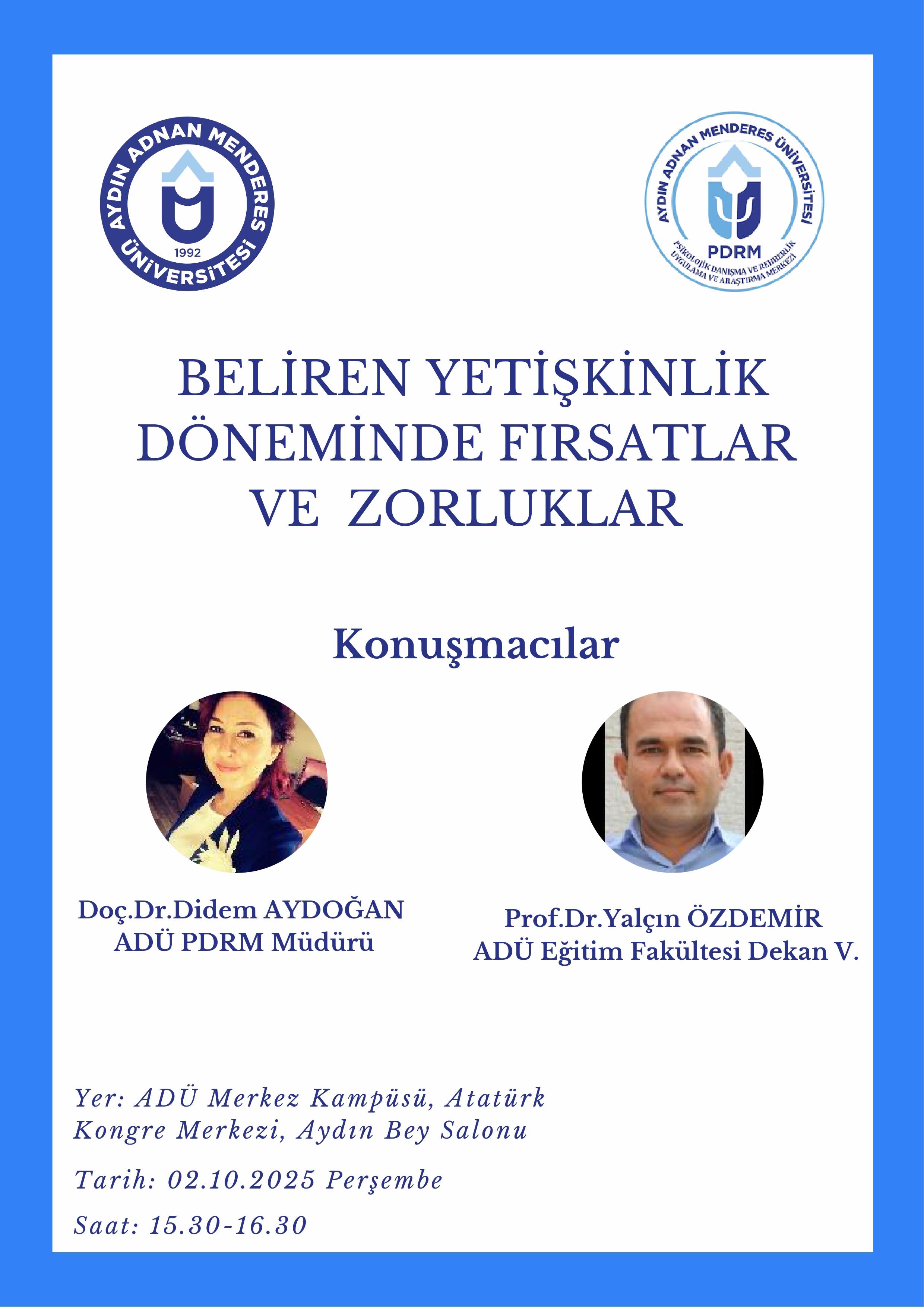 Merkezimiz tarafından 2 Ekim 2025 Perşembe günü 15.30' da Atatürk Kongre Merkezi, Aydın Bey Salonu' nda "Beliren Yetişkinlik Döneminde Fırsatlar ve Zorluklar" konulu seminer gerçekleştirilecektir.