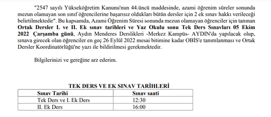Yaz Okulu Sonu Tek Ders ve Ek Ders Sınavları