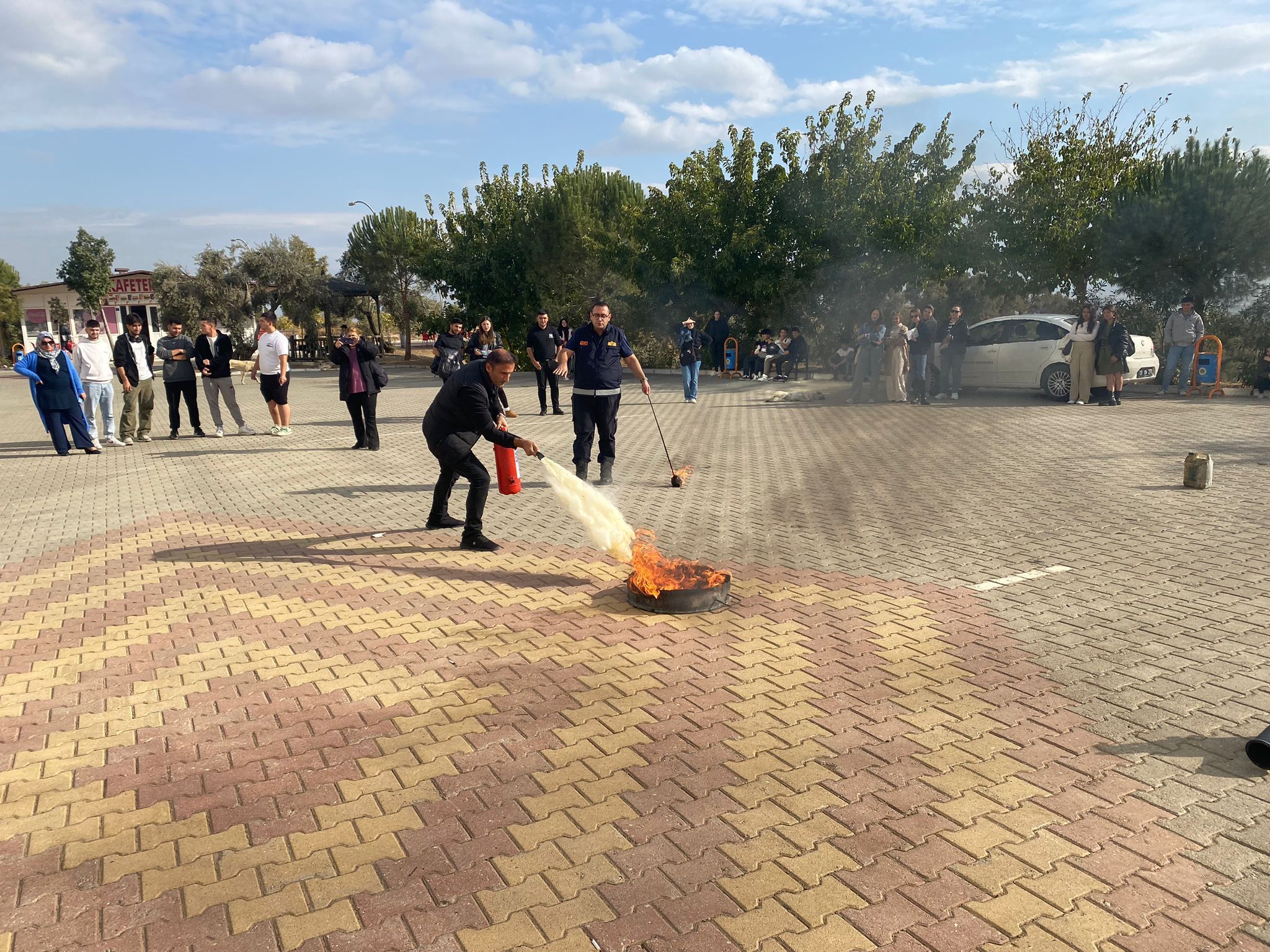 Yangın konularında bilgilendirme yapılan eğitimde mevzuat çerçevesinde bulunan "Söndürme", "Koruma", "Arama Kurtarma ve Tahliye" ekiplerinde destek elemanı olarak görevlendirilen kişilerin sorumlulukları ele alındı ve bahçede pratik eğitim verildi.