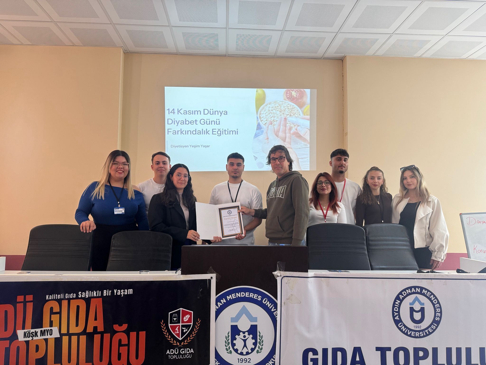 Aydın Adnan Menderes Üniversitesi Gıda Topluluğu tarafından 14 Kasım Dünya Diyabet Günü kapsamında düzenlenen etkinlik, büyük ilgi gördü. Konferans salonunda gerçekleştirilen program, topluluk üyeleri ve öğrencilerin yoğun katılımıyla gerçekleşti.