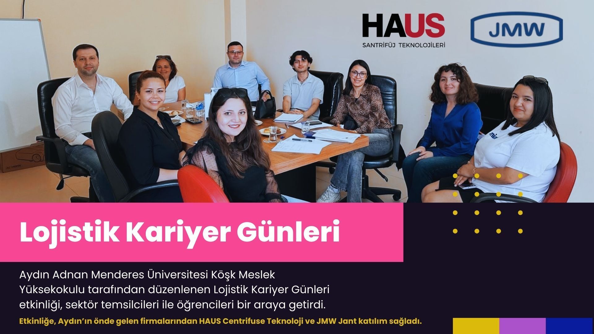 HAUS Centrifuse Teknoloji’yi temsilen Murat Karadeniz, JMW Jant’ı temsilen ise Gizem Dıramsız konuÅŸmacı olarak yer aldı. Katılımcılar, firmalarında lojistik uzmanı pozisyonlarının kapsamı ve kariyer olanakları hakkında öÄŸrencilere bilgi verdi. Ayrıca, KöÅŸk MYO öÄŸrencilerinin iÅŸletmelerde gerçekleÅŸtirdiÄŸi uzun dönem staj iÅŸ birliklerinden duydukları memnuniyeti dile getirdiler.
