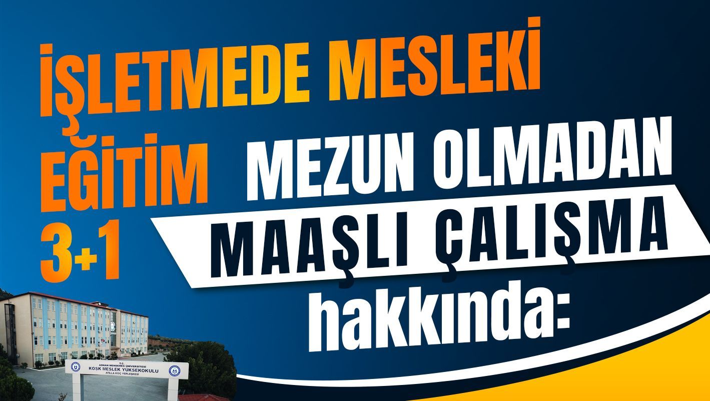 Aydın Adnan Menderes Üniversitesi Senatosunda 26.06.2024 tarihinde kabul edilerek yürürlüÄŸe giren İşletmede Mesleki EÄŸitim Uygulamasının hayata geçmesinin müjdesi Rektörümüz Prof. Dr. Bülent KENT tarafından verildi. KöÅŸk Meslek Yüksekokulu olarak öÄŸrencilerimizin mezun olmadan önce sektörde tecrübe kazanmasını saÄŸlayacak “İşletmede Mesleki EÄŸitim” sistemine adım atmanın heyecanını yaşıyoruz.