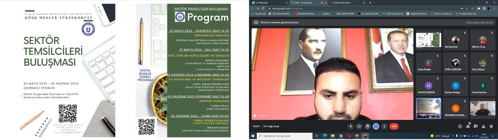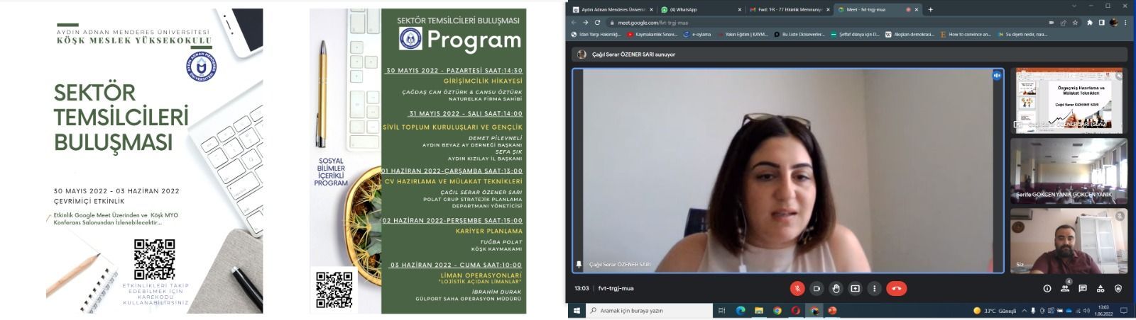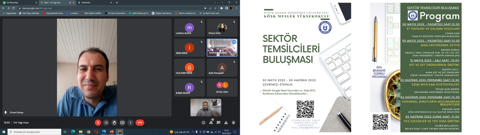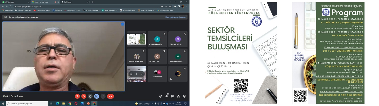Üniversitemiz ve okulumuz kalite ve stratejik hedefleri kapsamında, Yüksekokulumuz bünyesinde ÖÄŸr. Gör. Dr. Onur DURUKAL moderatörlüÄŸünde öÄŸretim elemanlarının tamamının görev aldığı 30 Mayıs 2022 - 03 Haziran 2022 tarihleri arasında gerçekleÅŸtirilen "Sektör Temsilcileri BuluÅŸması" adlı çevrimiçi etkinlik baÅŸarı ile tamamlanmıştır. Etkinlik kapsamında KöÅŸk Kaymakamı TuÄŸba POLAT, Karasüt Süt ve Süt Ürünleri Kalite Sorumlusu Sıdıka USLU, Söke DeÄŸirmencilik Sanayi ve Ticaret Anonim Åžirketi İşletme Müdürü Volkan AKIN, PaÅŸacan Et Entegre Tesisleri Kurucusu ve Yönetim Kurulu BaÅŸkanı Cihan Can, Naturelka firma sahibi ÇaÄŸdaÅŸ Can ÖZTÜRK, Aydın Kızılay İl BaÅŸkanı Sefa ÅžIK, Gülport Lojistik Saha Operasyon Müdürü İbrahim DURAK, Beyda Gıda/ Cafe Crown Üretim Müdürü Alper BALLIKAYA, , Ankara Özel Deva Park Hastanesi Diyetisyeni Feyza Nur DEMİR, EroÄŸlu Yerli Ürünler San. Ve Tic. Ltd. Åžti. Üretim Sorumlusu Erhan GÜNAY, Polat Grup Stratejik Planlama Departmanı Yöneticisi Çağıl Serar ÖZENER SARI konuÅŸmacı olarak katılım saÄŸlamıştır. Etkinlik süresince toplamda 314 öÄŸrenci etkinliÄŸe iliÅŸkin düzenlenen memnuniyet anket formunu doldurmuÅŸtur. Katılımcıların yaklaşık %42’si daha önce benzer bir etkinliÄŸe katılmamış olup etkinliÄŸe katılanların genel memnuniyet, internet baÄŸlantı hızı, içerik, konuÅŸmacılar ve organizasyon hakkında tatmin düzeylerinin derecelendirildiÄŸi sorudan alınan yanıtlara göre yaklaşık % 95 ‘i memnuniyet ve yüksek memnuniyet duyduklarını belirtmiÅŸlerdir. ÖÄŸrencilerin düÅŸüncelerini belirttikleri açık uçlu anket sorularında özellikle konuÅŸmacıların kendi çalışma alanları hakkında bilgilendirmelerini, tecrübelerini, etkinlik sonrası kendilerine sunulan iÅŸ ve staj imkanlarını önemli ve heyecan verici bulduklarını belirtmiÅŸlerdir.