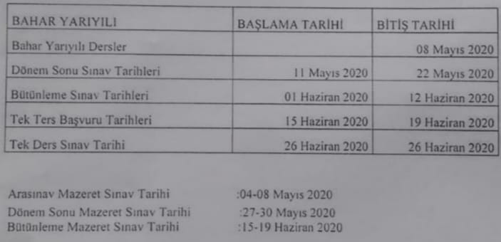 Bahar Yarıyılında gerçekleşecek olan final sınavları, mazeret sınavları ve bütünleme sınavları tarihleri ilan edilmiştir. Sınavlar, alınan karar doğrultusunda uzaktan eğitim sistemi üzerinden gerçekleştirilecektir.