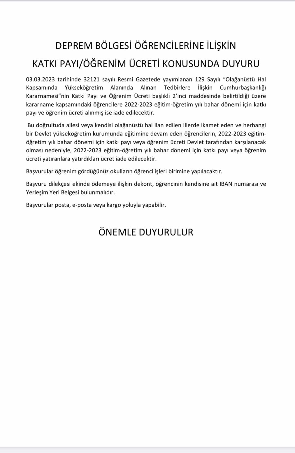 Deprem Bölgesinde olan Öğrencilere İlişkin Katkı payı/Öğrenim ücreti hakkında duyuru