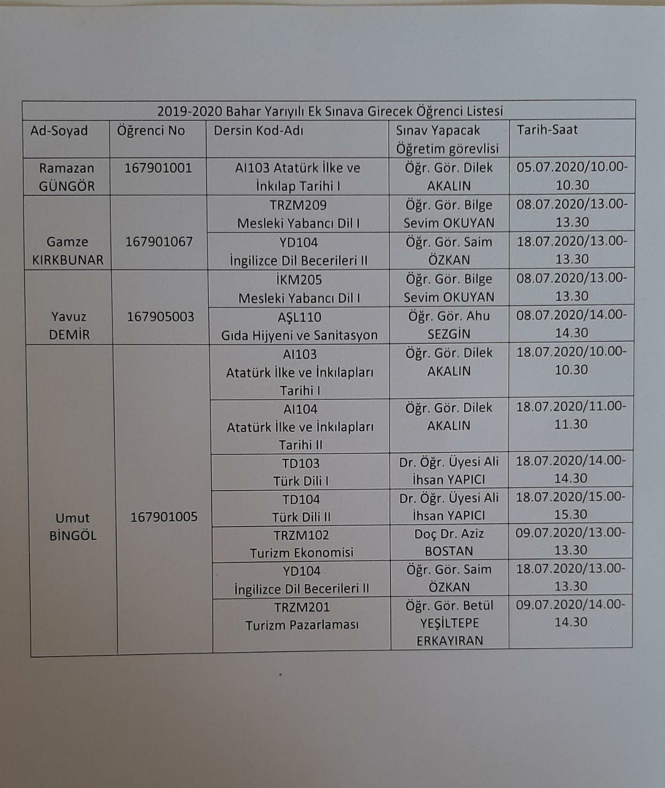 2019-2020 Bahar Yarıyılı Ek Sınava Girecek Öğrenci Listesi aşağıdaki ekte sunulmuştur.
