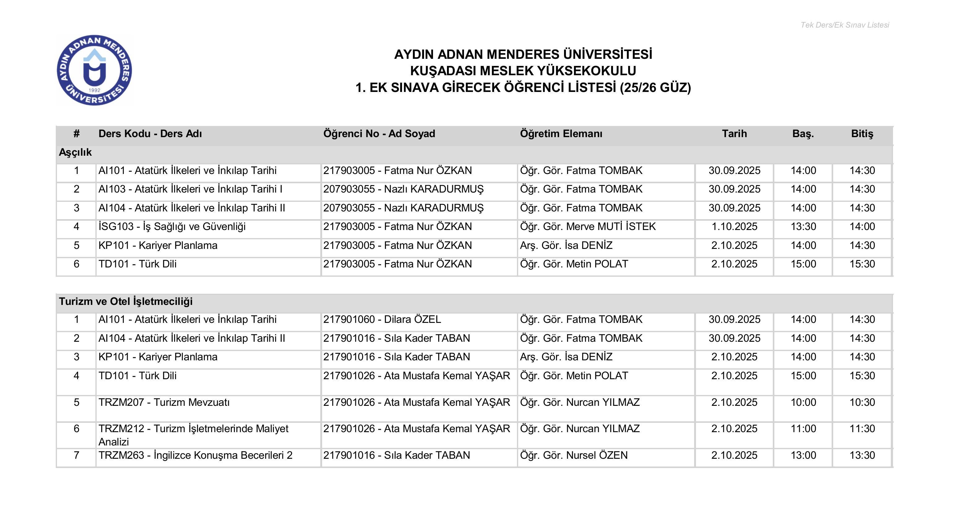 Yüksekokulumuza başvurarak İki (2) Ek Sınav Hakkı'ndan yararlanmak isteyen öğrencilerimize ait 1. Ek Sınav Listesi ve Sınav Programı (gün ve saat bilgisi) aşağıda sunulmuştur. Tüm sınavlar Yüksekokulumuzda yer alan dersliklerde (Davutlar Emine Kutlu Kampüsünde) yapılacaktır.