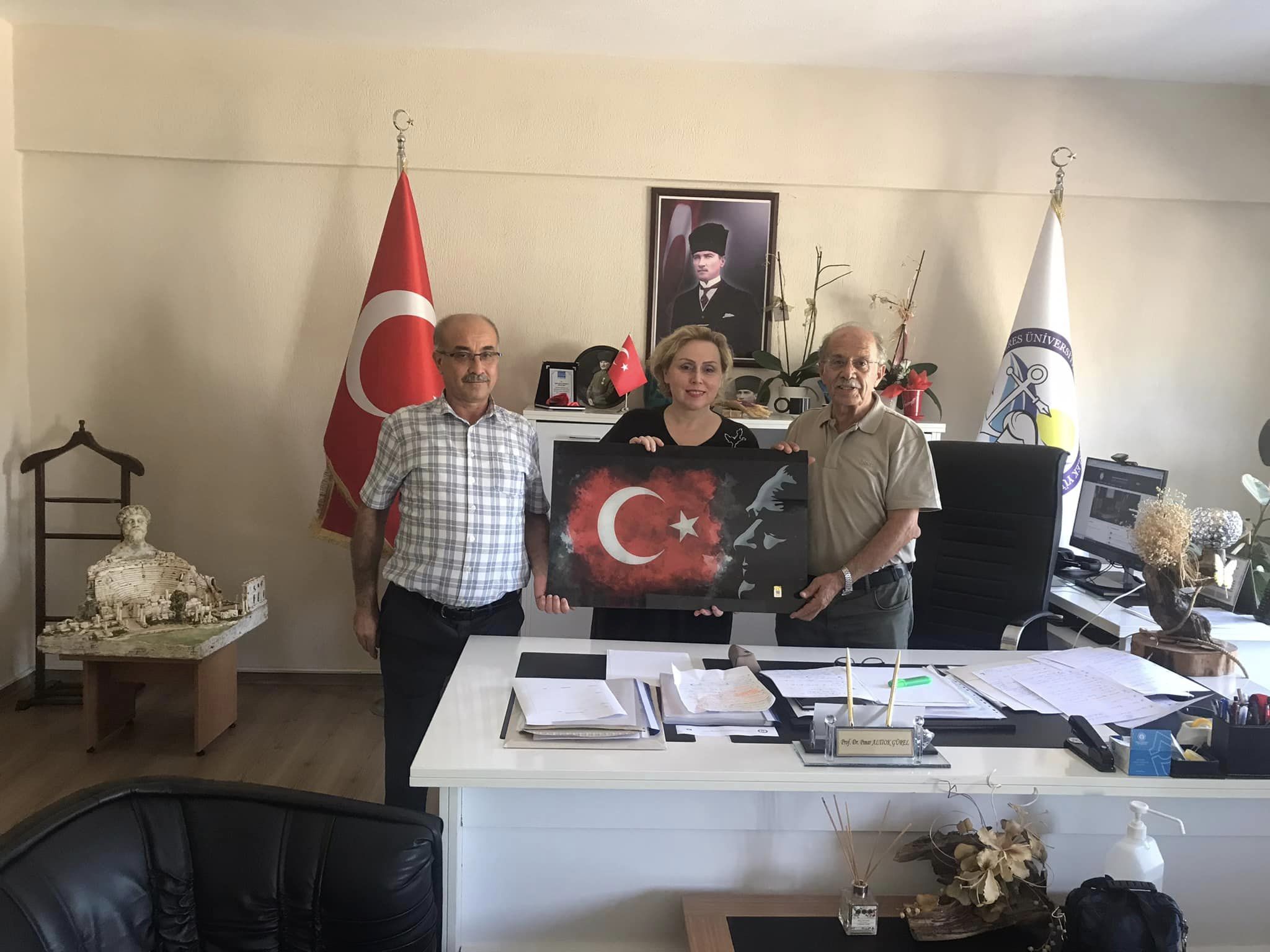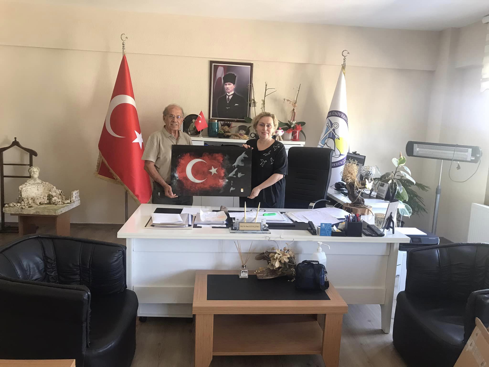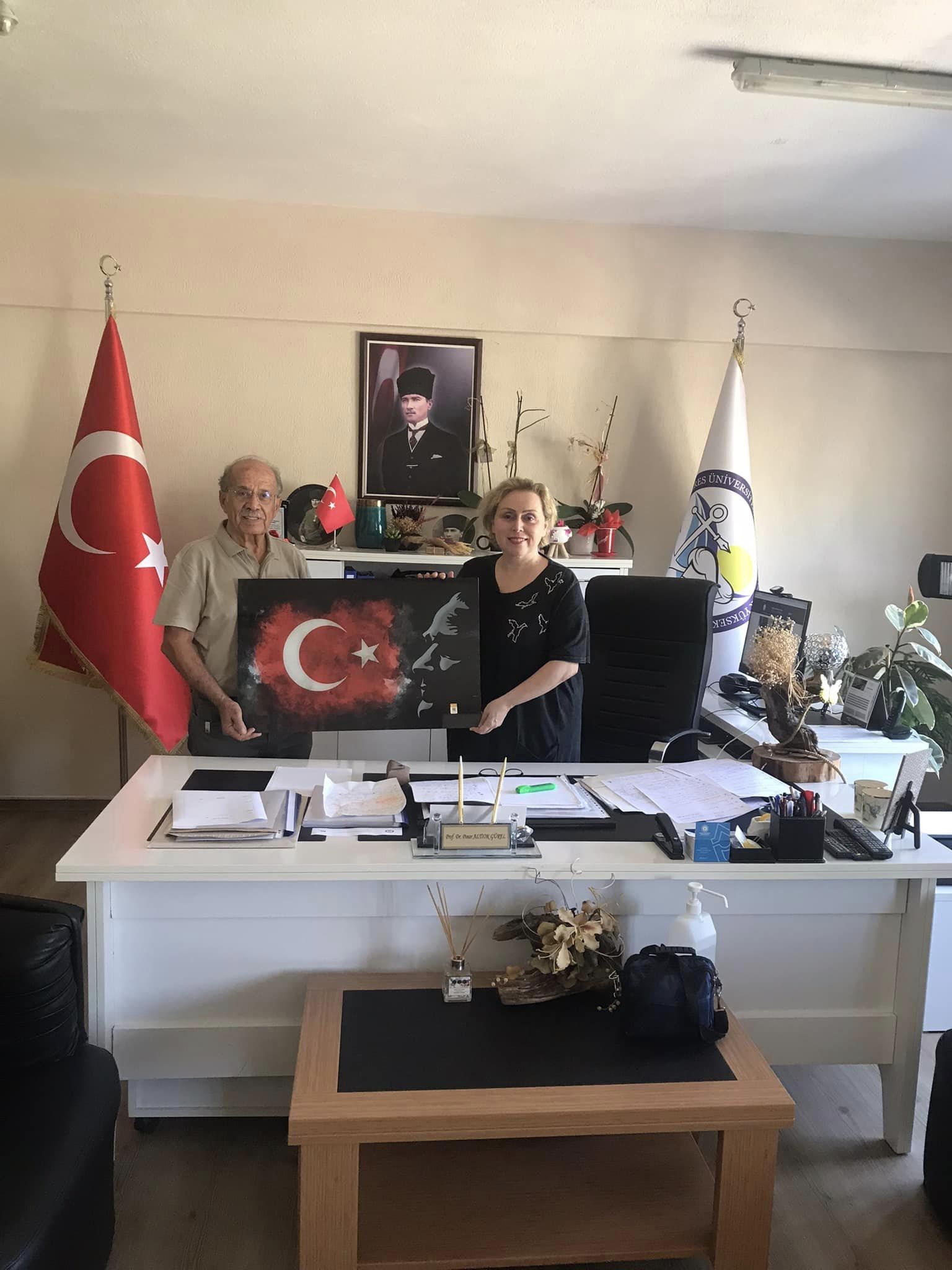 ADÜ’müzde uzun yıllar büyük emekleri ve hizmetleri bulunmuş olan değerli büyüğümüz ve emekli SKS Daire Başkanı’mız Sayın Fevzi ÇAVDAR, 26 Eylül 2024 tarihinde okulumuza ziyarette bulunarak bizleri onore etmişlerdir. Üniversitemiz’in ilk kuruluş günlerinden bugüne gelinceye kadar kat edilen yolları, birlik beraberlik rûhunu, sanat-kültür ve spor alanlarında kaydedilen başarıları, değerli bilgi birikimi ve deneyimleriyle bizlere aktaran kıymetli büyüğümüz bizler için büyük bir motivasyon ve coşku kaynağı olmuştur. ADÜ Kuşadası Meslek Yüksekokulu Müdürümüz Sayın Prof. Dr. Pınar ALTIOK GÜREL’e, Mustafa Kemal ATATÜRK ve şanlı bayrağımızla birlikte oluşturulmuş şâhâne bir tablo armağan eden Sayın Fevzi ÇAVDAR, bizler için çok anlamlı ve değerli olan kurum kültürü aktarımında bulunmuştur. Meslek Yüksekokulu Sekreterimiz Sayın Mustafa HAYIT’ın da hazır bulunduğu ziyarette, öğrencilerimizin eğilmesi gereken hobiler, sanatsal ve sportif faaliyetler ile ulusal ve uluslararası müsâbakaların gençlerimizi geliştirici özellikleri yönünde bizleri zenginleştiren bir sohbet gerçekleştirilmiştir. Çok değerli büyüğümüz Sayın Fevzi ÇAVDAR’a nâzik ziyâretleri ve çok kıymetli armağanı için gönülden teşekkür ediyor, sonsuz sevgi ve saygılarımızı sunuyoruz.