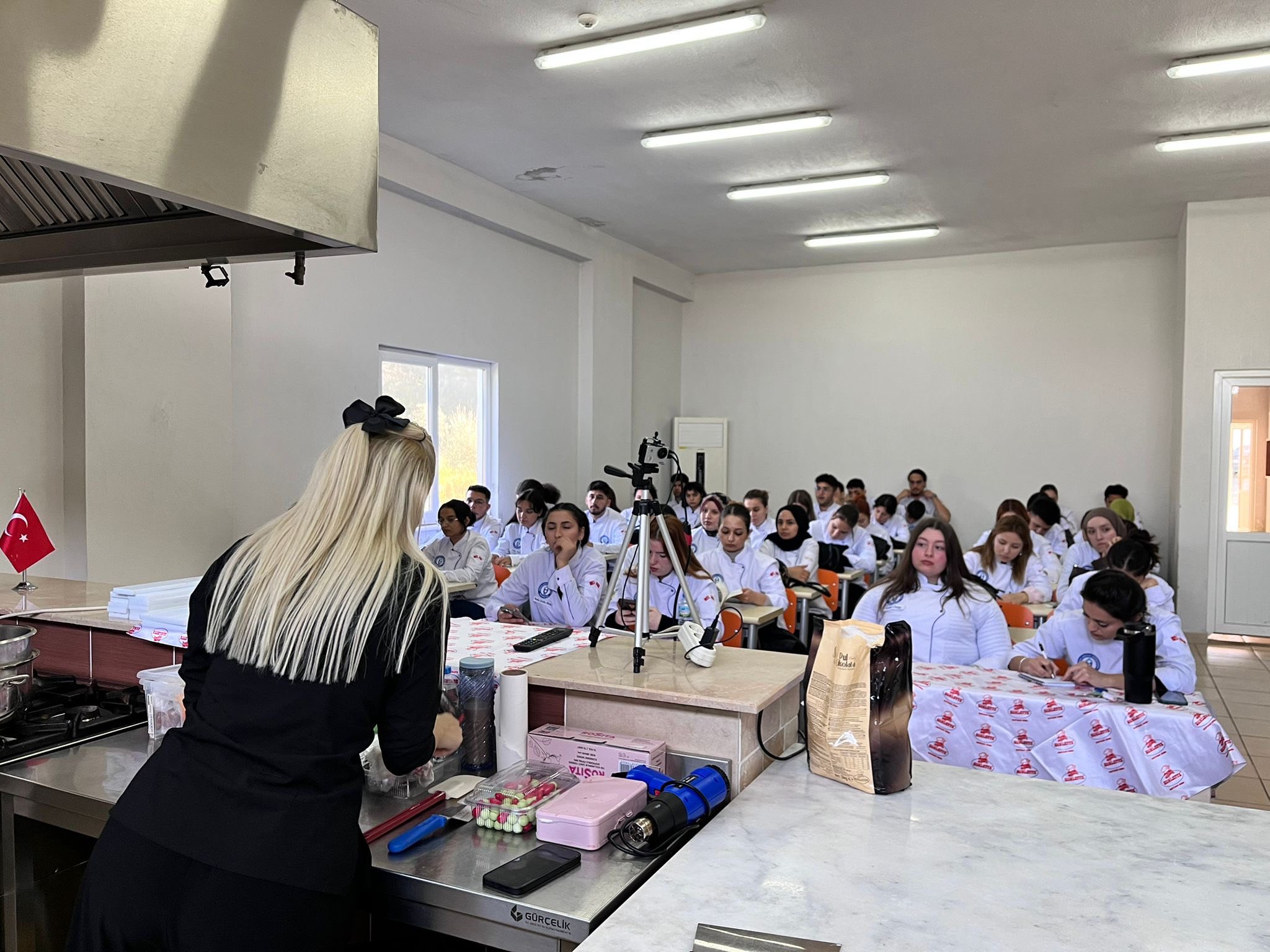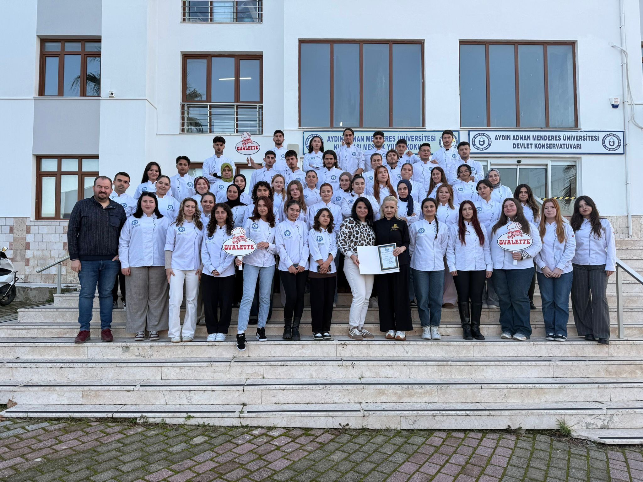 ADÜ Kuşadası Davutlar Meslek Yüksekokulumuzda 11 Aralık 2025 tarihinde Temel Pastacılık Teknikleri dersi kapsamında Katsan Ovalet firması sponsorluğuda Şef Demet Atakan tarafından öğrencilerimize Çikolata Eğitimi verilmiştir. Eğitim kapsamında temperleme, kalıp hazırlama ve renklendirme çalışmaları anlatılmıştır. Dersin öğretim elemanı Dr. Öğr. Üyesi Ahu Sezgin tarafından şefimize teşekkür belgesi sunulmuştur.
