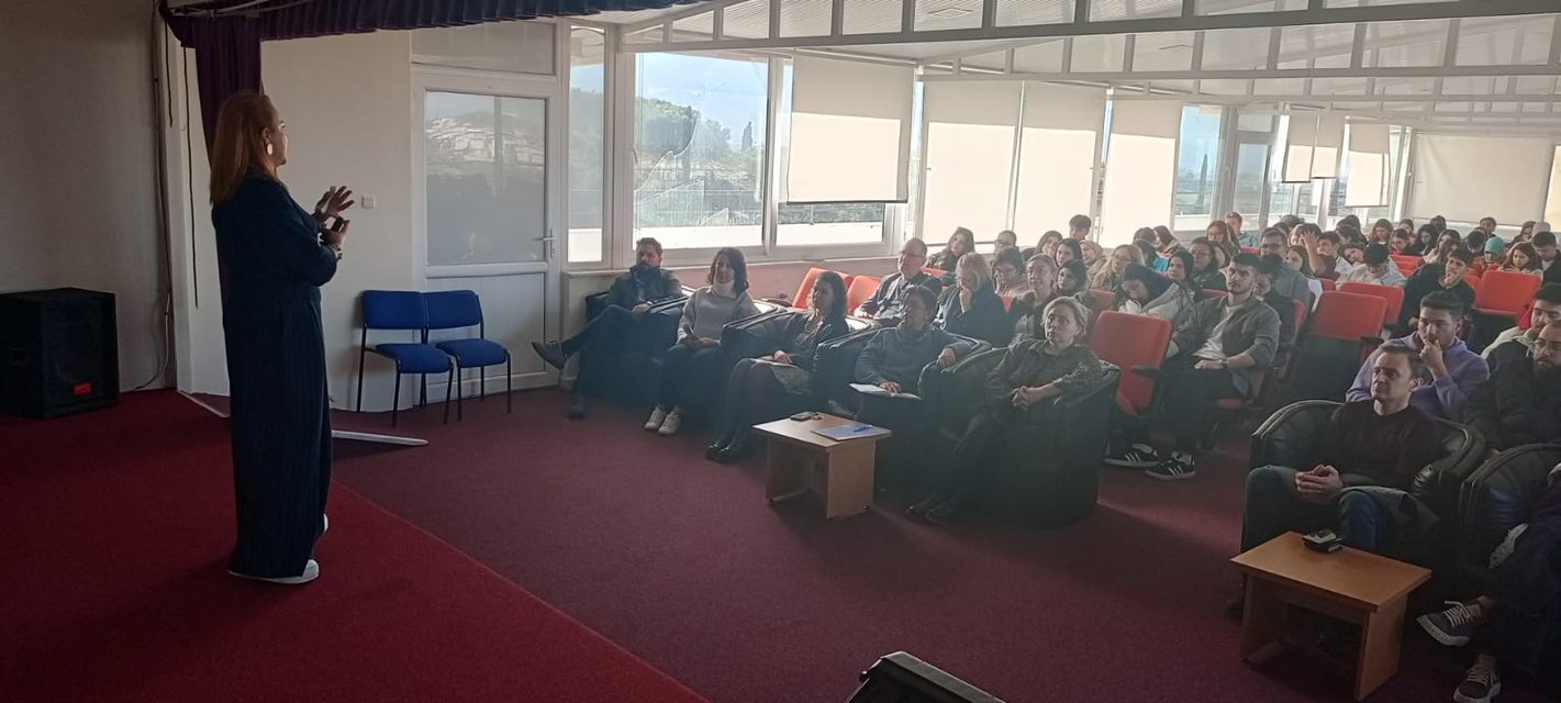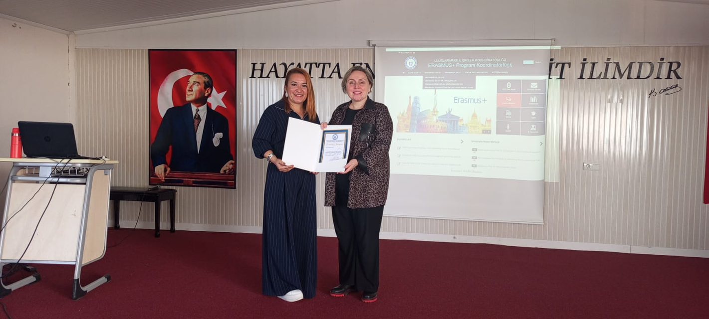 3 Aralık 2025 tarihinde, konferans salonumuzda yapılan toplantıda, Üniversitemiz Uluslararası İlişkiler Koordinatörlüğü görevlisi Öğr. Gör. Zeynep ÇETİN sunum gerçekleştirmiştir. Sunumda; Erasmus+ programının kapsamı, öğrenim ve staj için giden öğrenci hareketliliği, izlenmesi gereken adımlar, teknik işleyiş, Erasmus+ programını 2027 periyoduna kadar içeren yapısal eylem planları ve ayrıca akademik ve idari personele yönelik ders verme-eğitim alma giden personel hareketliliği konularında geniş kapsamlı bilgilendirmeler yapılmıştır. Akademik-idari personelimizin ve öğrencilerimizin hazır bulunduğu toplantı soru cevap bölümünün ardından, Meslek Yüksekokulu Müdürümüz Prof. Dr. Pınar ALTIOK GÜREL’in teşekkür belgesi takdimi ve fotoğraf çekimiyle sona ermiştir. Bilgilendirici ve kapsamlı sunumları ve emekleri için Zeynep ÇETİN’e teşekkür ediyor, sevgi ve saygılarımızı sunuyoruz.
