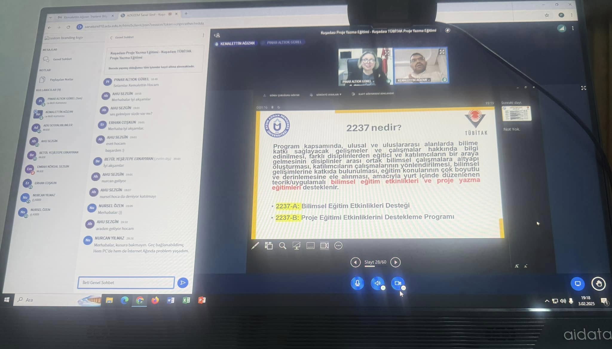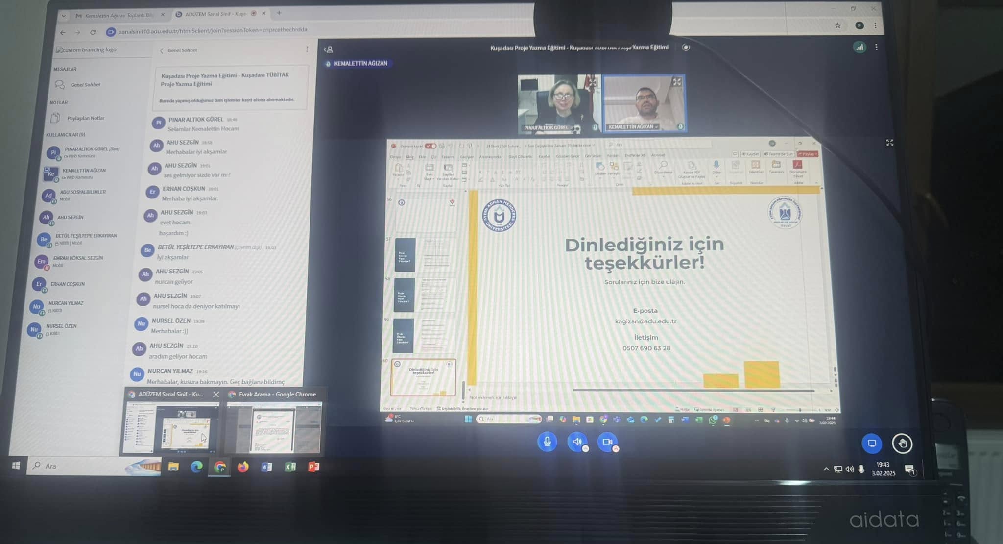 3 şubat 2025 tarihinde "TÜBİTAK 2237-A ve 2237-B Projeleri ” bilgilendirme ve eğitim toplantısı düzenlenmiştir. ADÜ Kuşadası Meslek Yüksekokulu Müdürümüz Sayın Prof. Dr. Pınar ALTIOK GÜREL ve akademik kadromuz hazır bulunmuştur. Proje ve AR-GE Ofisi Koordinatörü Sayın Öğr. Gör. Dr. Kemalettin AĞIZAN tarafından verilen eğitimde, “TÜBİTAK 2237-A ve 2237-B Projeleri” için proje yazma, projenin amaç ve kapsamı, proje başvuru koşulları, proje değerlendirme süreçleri, gerekli olan belgeler, proje yazımında teknik ve bilimsel bakış açıları konularında sunum yapılmış, ayrıca Meslek Yüksekokulu’muzun akademik çalışma alanlarıyla ilgili diğer TÜBİTAK projelerine ilişkin geniş kapsamlı bilgilendirmelerde bulunulmuştur. Eğitim programında, akademisyenlerimizin soruları cevaplandırılarak, proje analizleri üzerinde değerlendirmeler yapılmıştır.