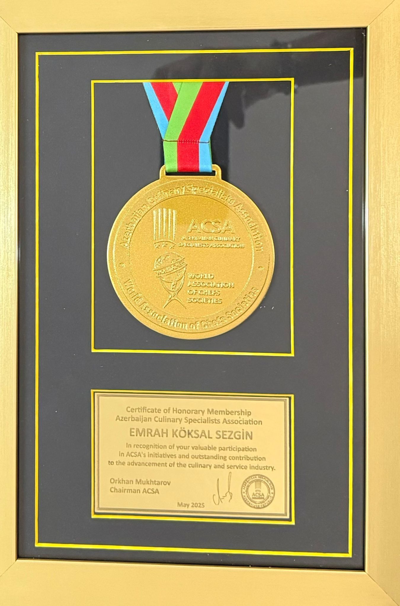 Meslek Yüksekokulumuz Otel, Lokanta ve İkram Hizmetleri Bölüm Başkanı Dr. Öğr. Üyesi Emrah Köksal Sezgin’e gastronomi alanındaki çalışmaları ve Türk Mutfağına katkıları sebebiyle Azerbaycan Mutfak Uzmanları Federasyonu’ndan Onursal Üyelik Beratı ve Madalyası verildi. Öğretim üyemizi tebrik ediyor, başarılarının devamını diliyoruz.