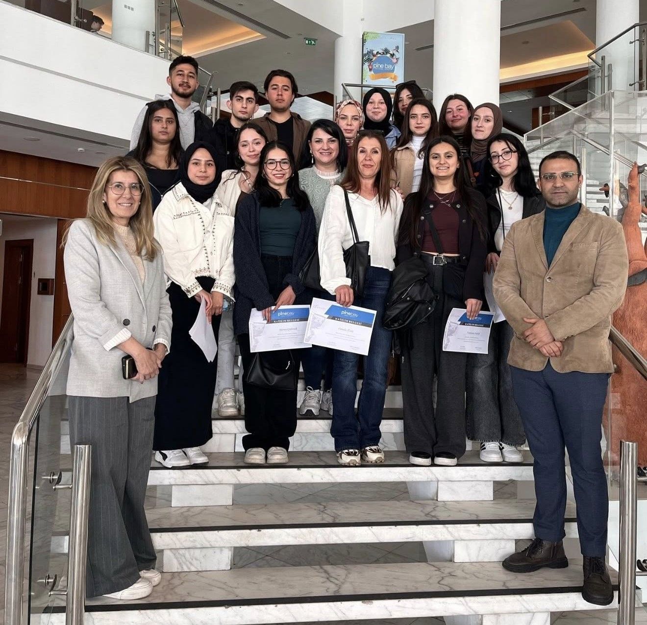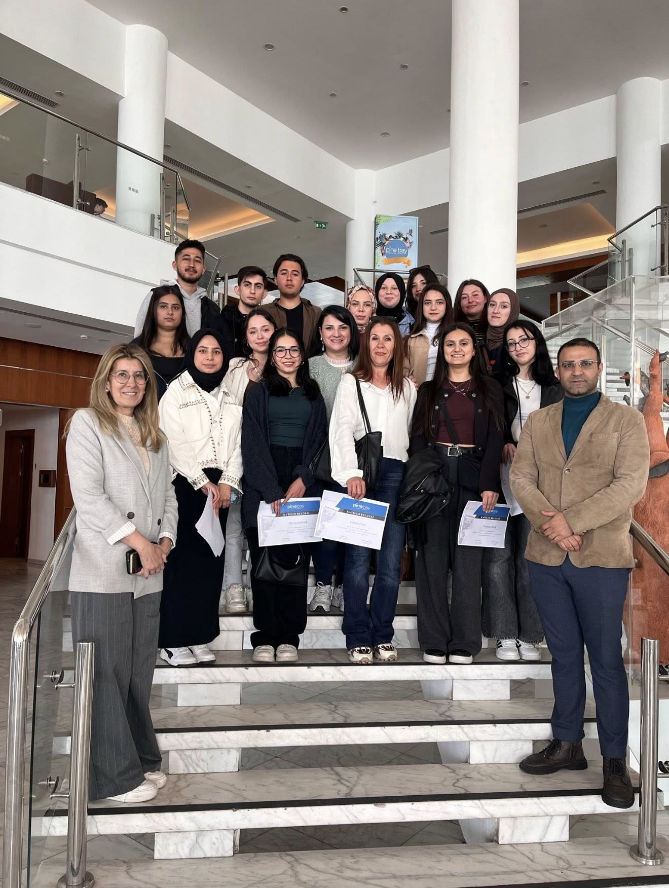 9 Nisan 2025 tarihinde Meslek Yüksekokulu’muz Dr. Öğr. Üyesi Sayın Ahu SEZGİN tarafından öğrencilerimizin yerinde öğretim ve bilgilendirmesi kapsamında Pine Bay Holiday Resort tesislerinde mesleki eğitim etkinliği düzenlenmiştir. Etkinlikte öncelikle Pine Bay Holiday Resort’un İnsan Kaynakları ve F&B ekipleri tarafından genel otel tanıtımı yapılmıştır. Sonrasında, etkinliğe Aşçılık ve İkram Hizmetleri Programlarımızın 1. Sınıf öğrencileri katılım gösterdikleri için otele ait barlar, mutfak ve restoranlar gezdirilip ayrı ayrı anlatılmıştır. Ardından ana restoranda öğrencilerimize yemek ikramında bulunulmuştur. Yaklaşık 4 saat süren etkinlik fotoğraf çekimi ile sona ermiştir.