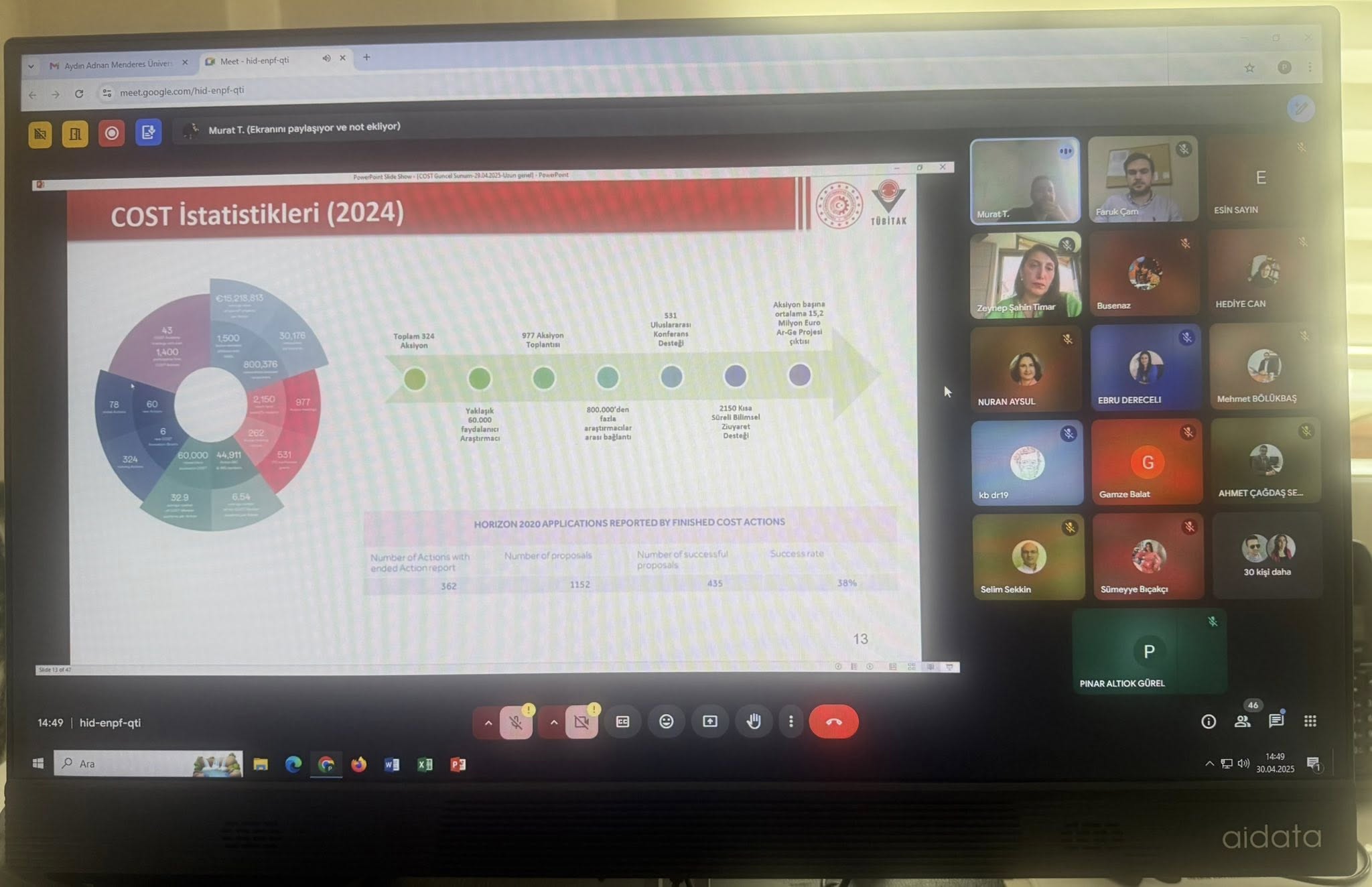 30 Nisan 2025 tarihinde Üniversitemiz Proje ve Ar-Ge Koordinatörlüğü tarafından düzenlenen COST (European Cooperation in Science and Technology) Bilim ve Teknolojide Avrupa İşbirliği aksiyon projeleri bilgilendirme toplantısına ADÜ Kuşadası Meslek Yüksekokulu Müdürümüz Sayın Prof. Dr. Pınar ALTIOK GÜREL tarafından katılım sağlanmıştır. Akademik yayın yapma ve network kurma odaklı projeler hakkında gerçekleştirilen toplantıda önce koordinatör kuruluş olan TÜBİTAK’ı temsilen TÜBİTAK Bilimsel Programlar Kıdemli Uzmanı Sayın Murat TILTAK tarafından COST aksiyonları konusunda geniş kapsamlı bir sunum yapılmış, ardından Karadeniz Teknik Üniversitesi Öğretim Gör. Dr. Sayın Zeynep Şahin TİMAR aksiyon yönetimi, aksiyon yönetim organları, COST üyeleri ve katılım, toplantılar ve eğitim okulları, STSM destekleri, konferans destekleri, sanal hareketlilik destekleri konularında bilgilendirici bir sunum yapmıştır. Daha sonra ADÜ Köşk MYO Öğr. Gör. Sayın Faruk ÇAM tarafından erken dönem kariyer araştırmacılığı, COST action projeleri ile tanışma, çalışma grubu toplantıları, yeni akademik networklerin edinilmesi konularında bilgilendirici bir sunum gerçekleştirmiştir. Toplantı soru cevap bölümünün ardından sona ermiştir. Bu öğretici ve kapsamlı sunumları ve emekleri için değerli hocalarımıza ve araştırmacılarımıza teşekkür ediyor, sevgi ve saygılarımızı sunuyoruz.