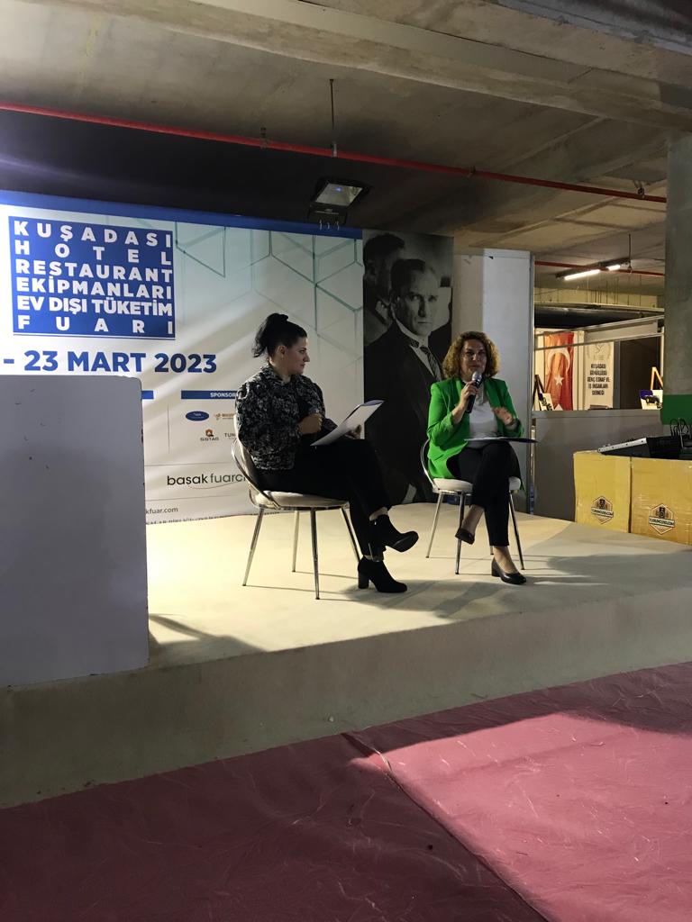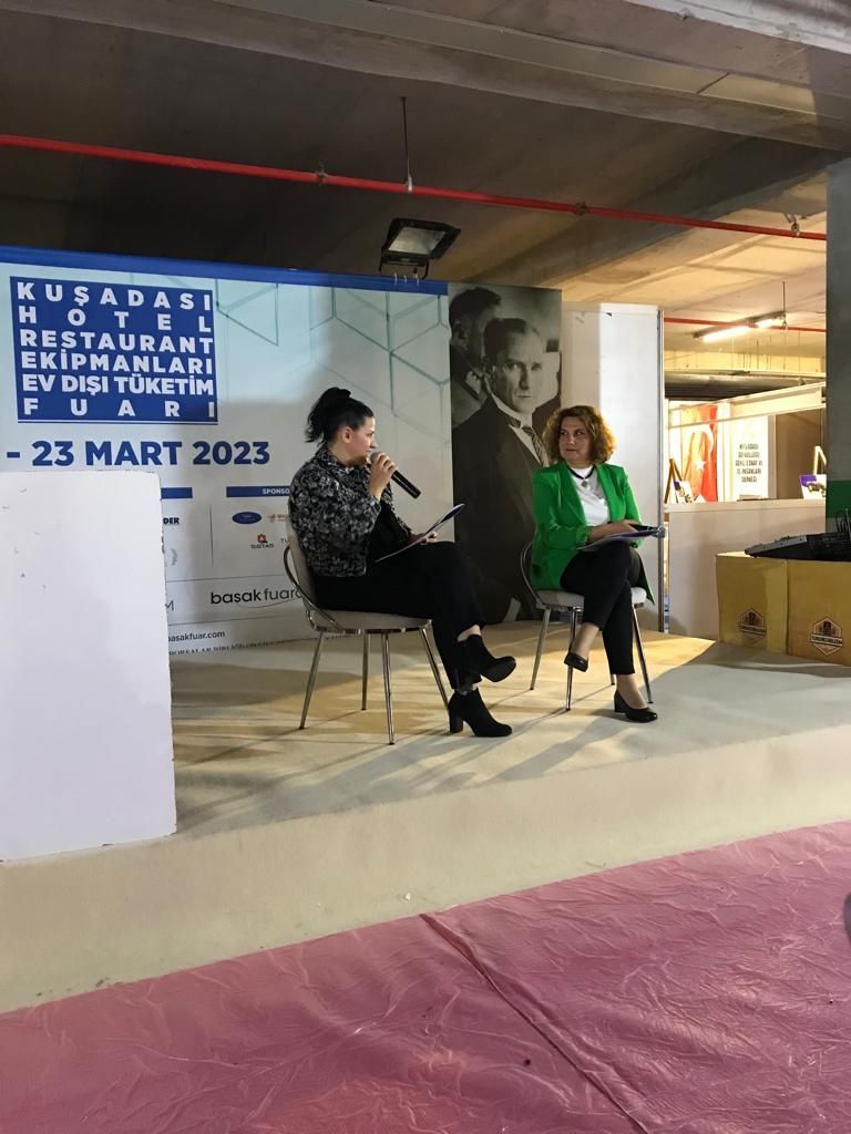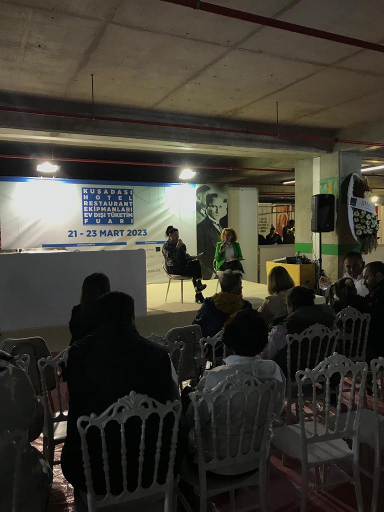 “Kuşadası Otel Restoran Ekipmanları ve Ev Dışı Tüketim Fuarı” kapsamında 23 Mart 2023 tarihinde Aydın Adnan Menderes Üniversitesi Turizm Fakültesi’nden Prof. Dr. Başak Burcu EKE ve Aydın Adnan Menderes Üniversitesi Davutlar MYO’dan Öğr. Gör. Dr. Ahu SEZGİN, “Türk Kültüründe Ocak, Mutfak Ve Kadim Yemekler” konulu konuşmalarını gerçekleştirmişlerdir.