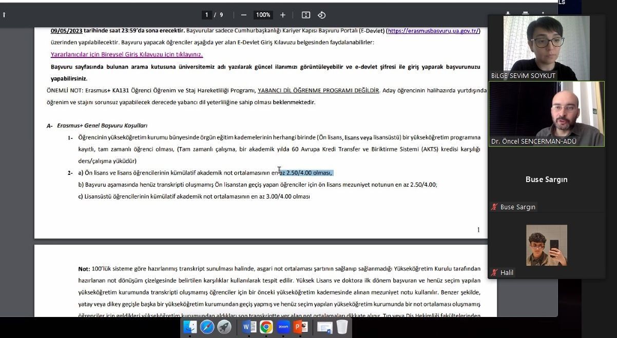 Davutlar MYO Erasmus+ Program Koordinatörü Öğr. Gör. Bilge Sevim SOYKUT ve Uluslararası İlişkiler Koordinatörlüğü Direktörü Dr. Öğr. Üyesi Öncel SENÇERMAN tarafından 19 Nisan 2023 tarihinde çevrimiçi olarak öğrencilere Erasmus+ Staj Hareketliliği Programı ile ilgili gelişmeler ve başvuru sürecine dair bilgiler aktarıldı.