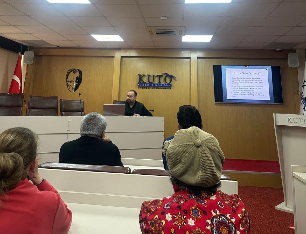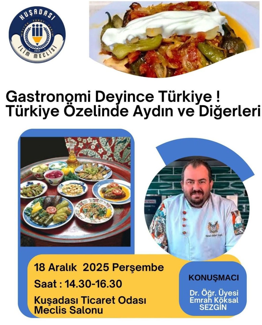 Kuşadası İlim Meclisi Tarafından 18 Aralık 2025 tarihinde Kuşadası Ticaret Odası Konferans Salonunda gerçekleştirilen “Gastronomi Deyince Türkiye! Türkiye Özelinde Aydın ve Diğerleri” adlı söyleşi ADÜ Kuşadası Davutlar Meslek Yüksekokulu Otel, Lokanta ve İkram Hizmetleri Bölüm Başkanı Dr. Öğr. Üyesi Emrah Köksal Sezgin tarafından gerçekleştirilmiş. Söyleşiye Kuşadası İlim Meclisi üyeleri, Kuşadası halkı ve öğrenciler katılım göstermiştir.