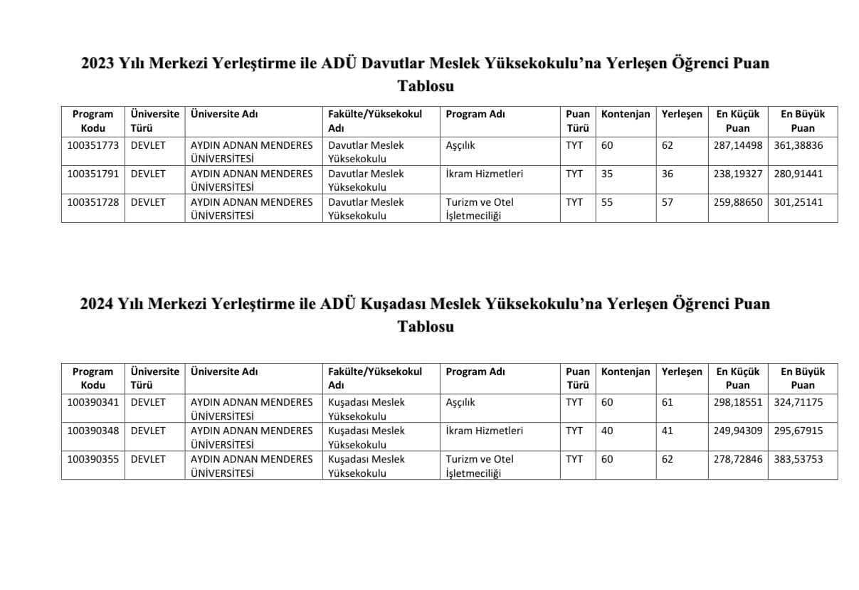 ADÜ KuÅŸadası Meslek Yüksekokulu olarak 2024 yılı merkezi yerleÅŸtirme ile öÄŸrenci alan yükseköÄŸretim ön lisans puanlarımızın bu seneki sonuçları bizi gururlandırmıştır. Okulumuza yerleÅŸen öÄŸrencilerimizin kontenjan, taban ve tavan puanlarındaki baÅŸarı ivmesi, geçen yıla göre gözle görülür bir yükseliÅŸ kaydetmiÅŸtir. Sayın Rektör Hocamız Prof. Dr. Bülent KENT’in ADÜ’müzü her geçen gün daha yükseklere taşıma vizyonunun bir eseri olan bu sonuç için kendisine müteÅŸekkiriz. Okulumuzun fiziki, idari ve akademik geliÅŸiminde destekleriyle bizlere güç veren; Sayın Rektör Hocamız Prof. Dr. Bülent KENT’e, Rektör Yardımcılarımız Sayın Prof. Dr. Cemal İYEM ve Sayın Prof. Dr. Erkan SALAN’a, Genel Sekreterimiz Sayın Prof. Dr. Bertan AKYOL’a ve RektörlüÄŸümüzün tüm birimlerine sonsuz teÅŸekkürlerimizi sunuyoruz. Meslek Yüksekokulumuzda bu baÅŸarının saÄŸlanmasında emeÄŸi geçen akademik ve idari personelimize gönülden teÅŸekkür ediyoruz. SaygıdeÄŸer velilerimizin ve aziz devletimizin bizlere emaneti olarak gördüÄŸümüz deÄŸerli evlatlarımızı bu baÅŸarılarından dolayı tebrik ediyor, 2024 – 2025 eÄŸitim öÄŸretim döneminde daha büyük baÅŸarılara yelken açmak üzere okulumuza özlemle bekliyoruz.