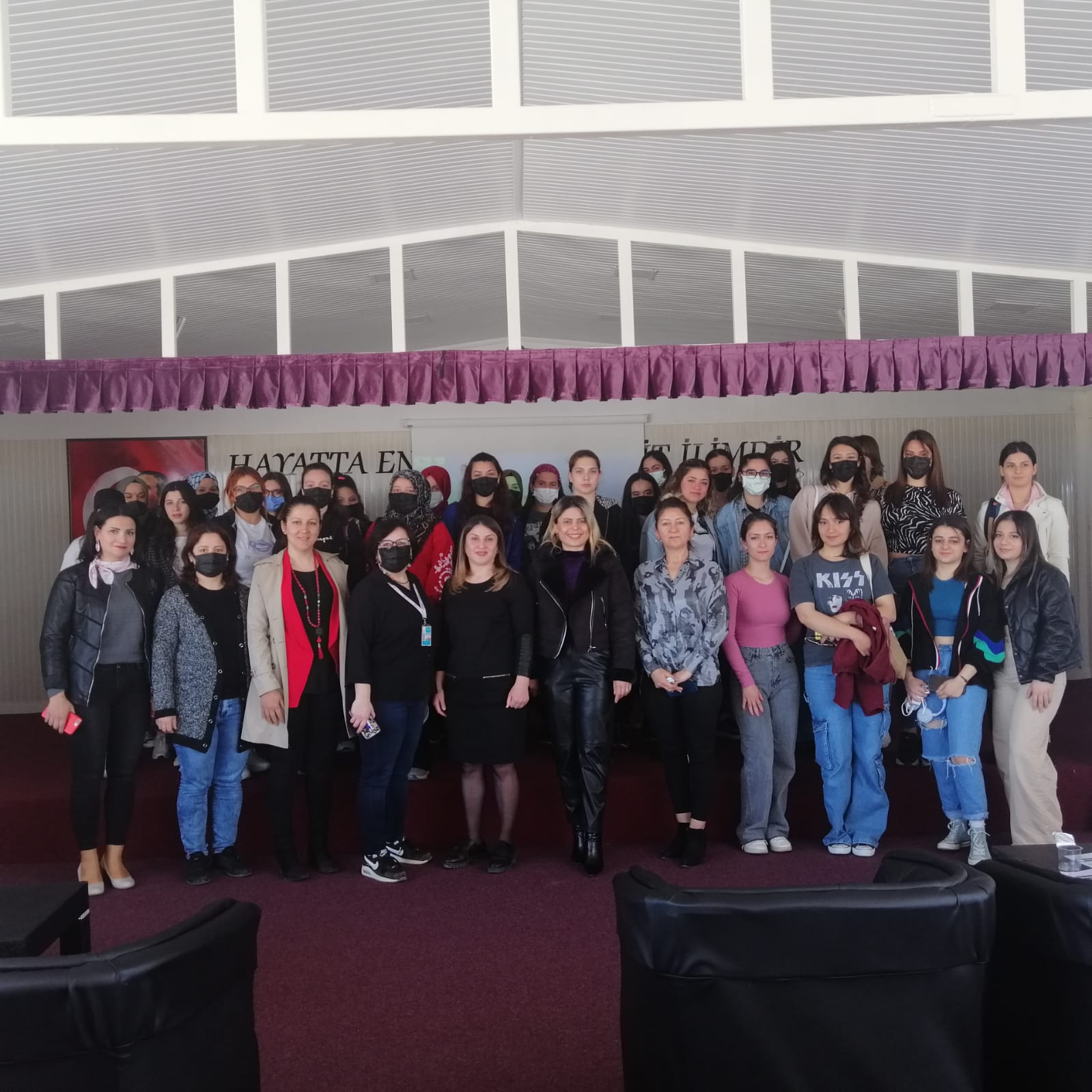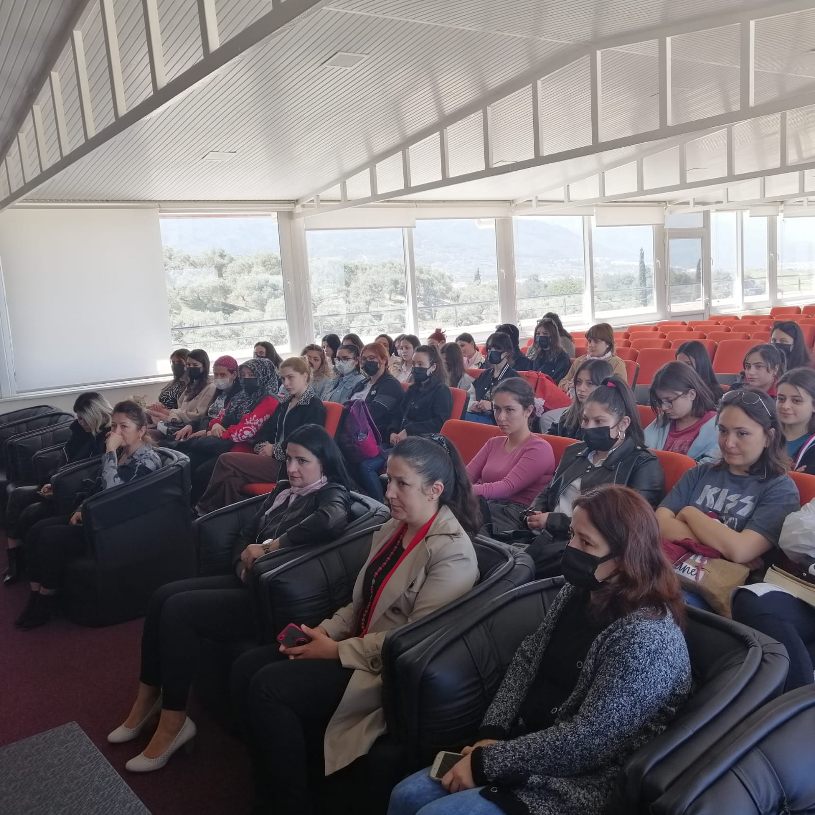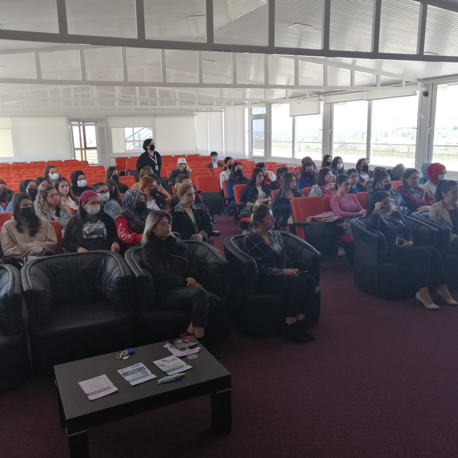 Aydın Valisi Sayın Hüseyin Aksoy ve eÅŸi Hülya Aksoy hanımefendi tarafından baÅŸlatılan ''Aydın Kadın SaÄŸlığı EÄŸitim Projesi'' kapsamında Yüksekokulumuz konferans salonunda kadın öÄŸretim elemanları ve kız öÄŸrencilerimizin katılımı ile 14 Nisan 2022 tarihinde KuÅŸadası İlçe SaÄŸlık MüdürlüÄŸü'nden gelen Dr. Elnara AbdullahoÄŸlu ve Ebe Aysel İpek ErdoÄŸan tarafından Proje ve kadın saÄŸlığı hakkında bilgilendirme yapıldı. Meme kanseri, serviks kanseri, kolorektal kanserler, sigara, uyuÅŸturucu, teknoloji bağımlılığı ve saÄŸlığa zararları, obezite ve korunma yolları, akılcı ilaç kullanımı ve kadına yönelik ÅŸiddet konularında deÄŸerli bilgiler paylaşıldıktan sonra, soru ve cevap ile etkinlik son buldu.