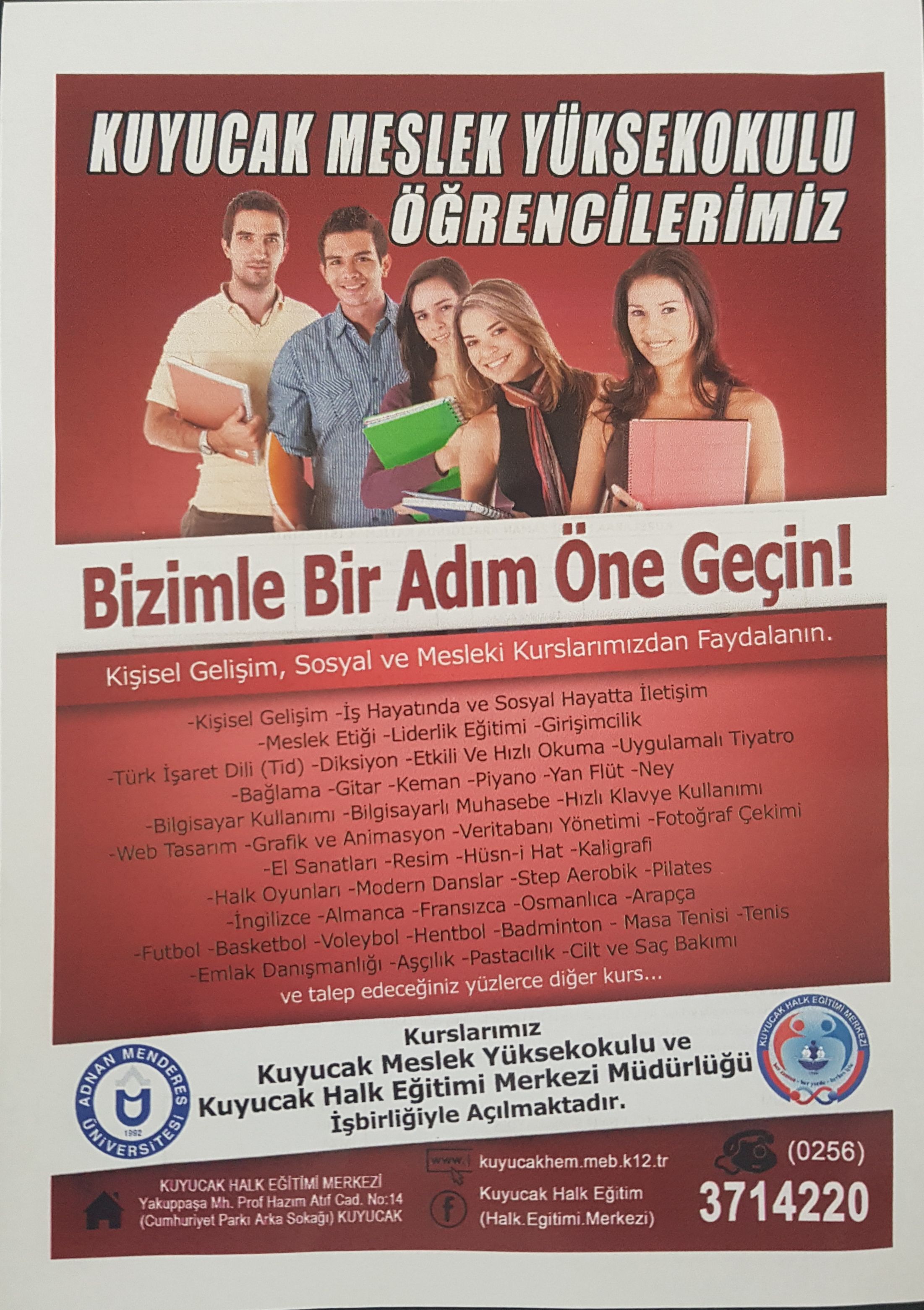 Kuyucak Myo öÄŸrencilerinin kiÅŸisel, sosyal ve mesleki donanımlarını geliÅŸtirmelerine yönelik yapılan programda Kuyucak Halk EÄŸitim Merkezi Müdür Yrd. Hakan MORAN, Rehber ÖÄŸr. Müge ERTÜRK ve İngilizce ÖÄžR. Fatma KOCABAÅž kurslar hakkında bilgilendirmeler yaptılar.