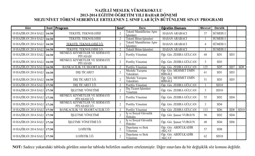 09.06.2014 Pazartesi yapılacak olan Mezuniyet töreninin hava muhalefeti sebebiyle 10.06.2014 Salı günü saat 10:30'a ertelenmiş olması sebebiyle 10.06.2014 Salı günü yapılacak olan 2. öğrencilerinin Bütünleme sınavları aynı gün saat 16:30 ve 17:30 oturumlarında yapılacaktır.
