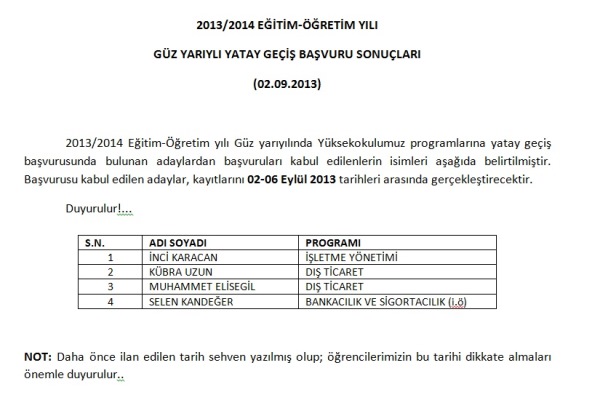 2013/2014 EĞİTİM ÖĞRETİM YILI GÜZ DÖNEMİ YATAY GEÇİŞ BAŞVURU SONUÇLARI