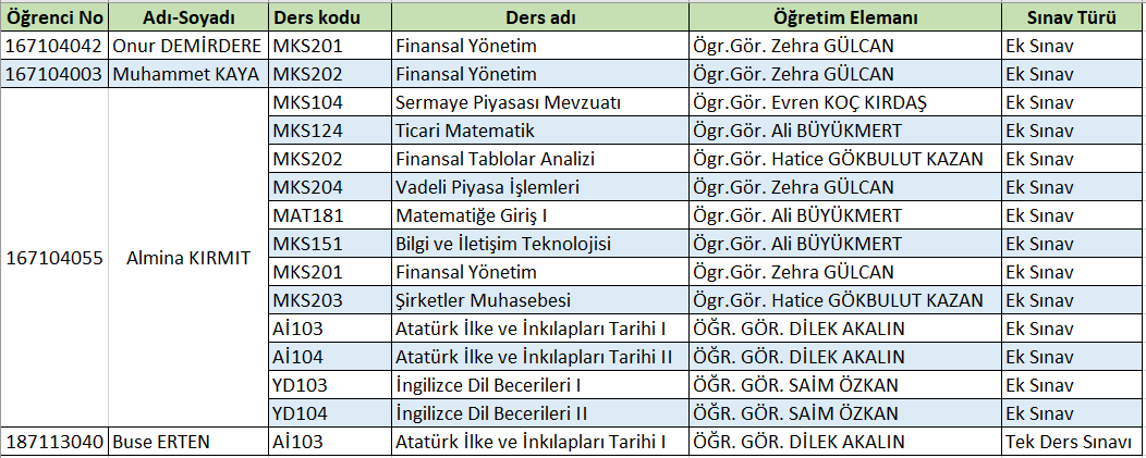Ek Sınav ve Tek Ders(5i tek ders sınavı) Sınavlarına Katılacak Öğrenci ve Dersin Sorumlu Hoca Listesi