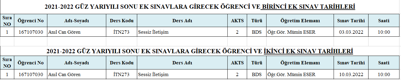2021-2022 Eğitim Öğretim Yılı Güz Yarıyılı Sonu Ek Sınava Girecek Öğrenci Listesi ve Sınav Pragramı