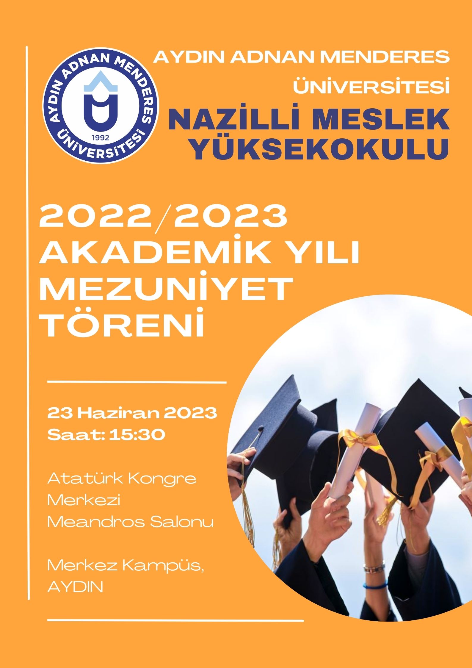 Yüksekokulumuz Mezuniyet Töreni; 23 Haziran 2023 Cuma günü saat 15:30'da merkez kampüste (Aydın) bulunan Atatürk Kongre Merkezi Meandros Salonu'nda gerçekleştirilecektir.