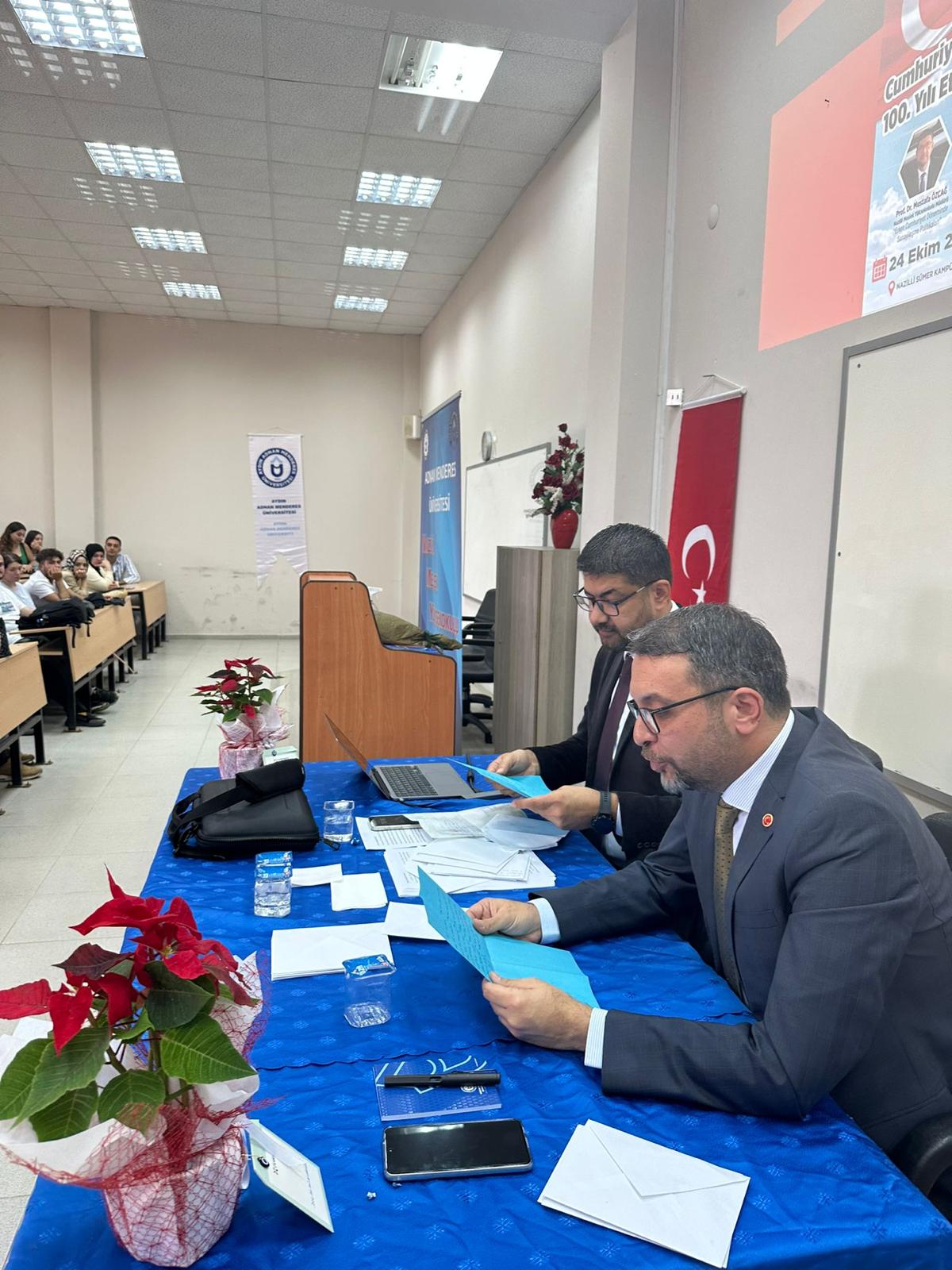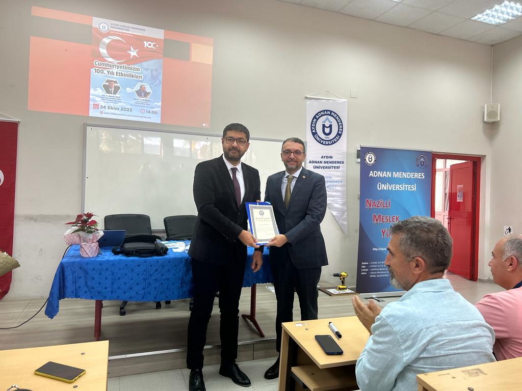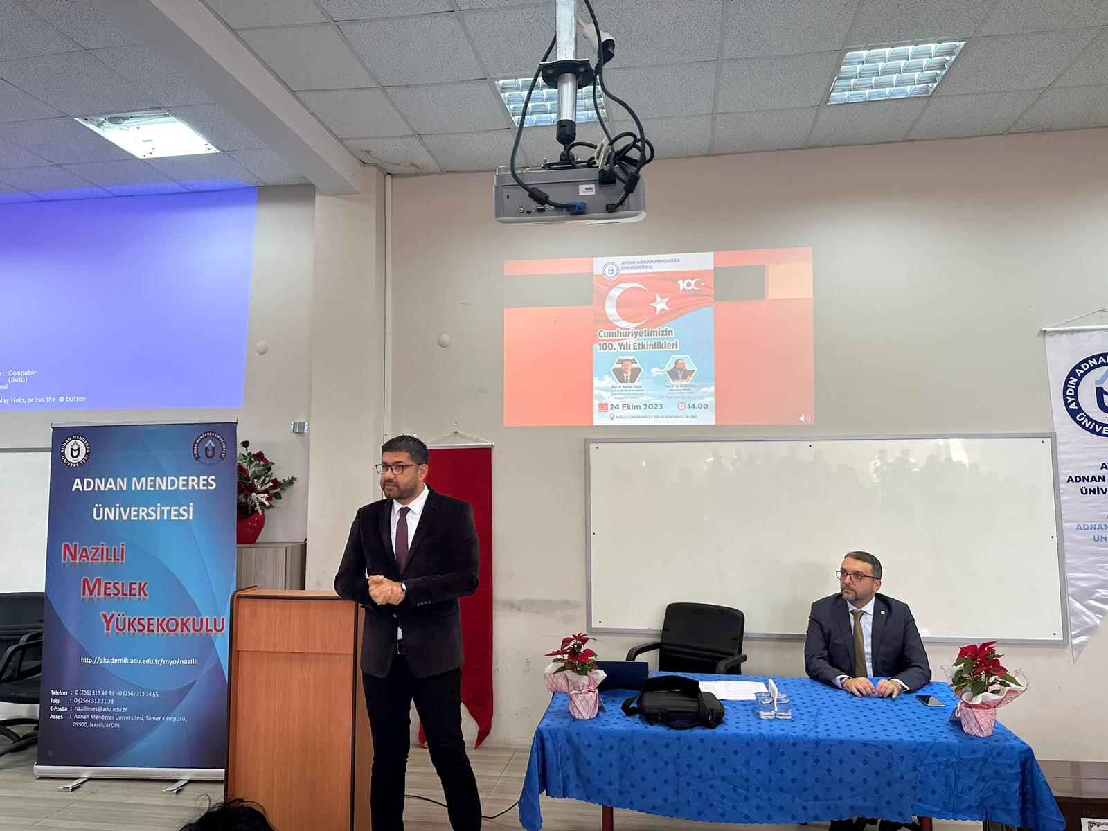 Aydın Adnan Menderes Üniversitesi Nazilli Meslek Yüksekokulu tarafından, Cumhuriyetin 100. Yılı Etkinlikleri kapsamında, 24 Ekim 2023 tarihinde düzenlenen konferansta, Erken Cumhuriyet Dönemi SanayileÅŸme Politikaları ile Cumhuriyet Fikri ve İdeali konuları konuÅŸuldu. Nazilli Meslek Yüksekokulu müdürü Prof. Dr. Mustafa ÖZÇAÄž, 29 Ekim 1923 ve 14 Mayıs 1950 döneminde uygulanan sanayileÅŸme politikaları hakkında karşılaÅŸtırmalı bilgiler verirken; Aydın İktisat Fakültesi Uluslararası İliÅŸkiler Bölümü öÄŸretim üyesi Doç. Dr. Ali BİLGENOÄžLU ise cumhuriyetin kurucu kadrolarının sahip olduÄŸu temel fikirler ve tam bağımsızlık mücadelesi hakkındaki görüÅŸlerini sundu. YoÄŸun bir katılımın gerçekleÅŸtiÄŸi konferansta, 2017 yılında ÖÄŸr. Gör. Filiz ERSÖZ öncülüÄŸünde, Nazilli Meslek Yüksekokulu öÄŸrencilerinin Cumhuriyetin 100. Yılına yazmış olduÄŸu mektuplar da okundu.