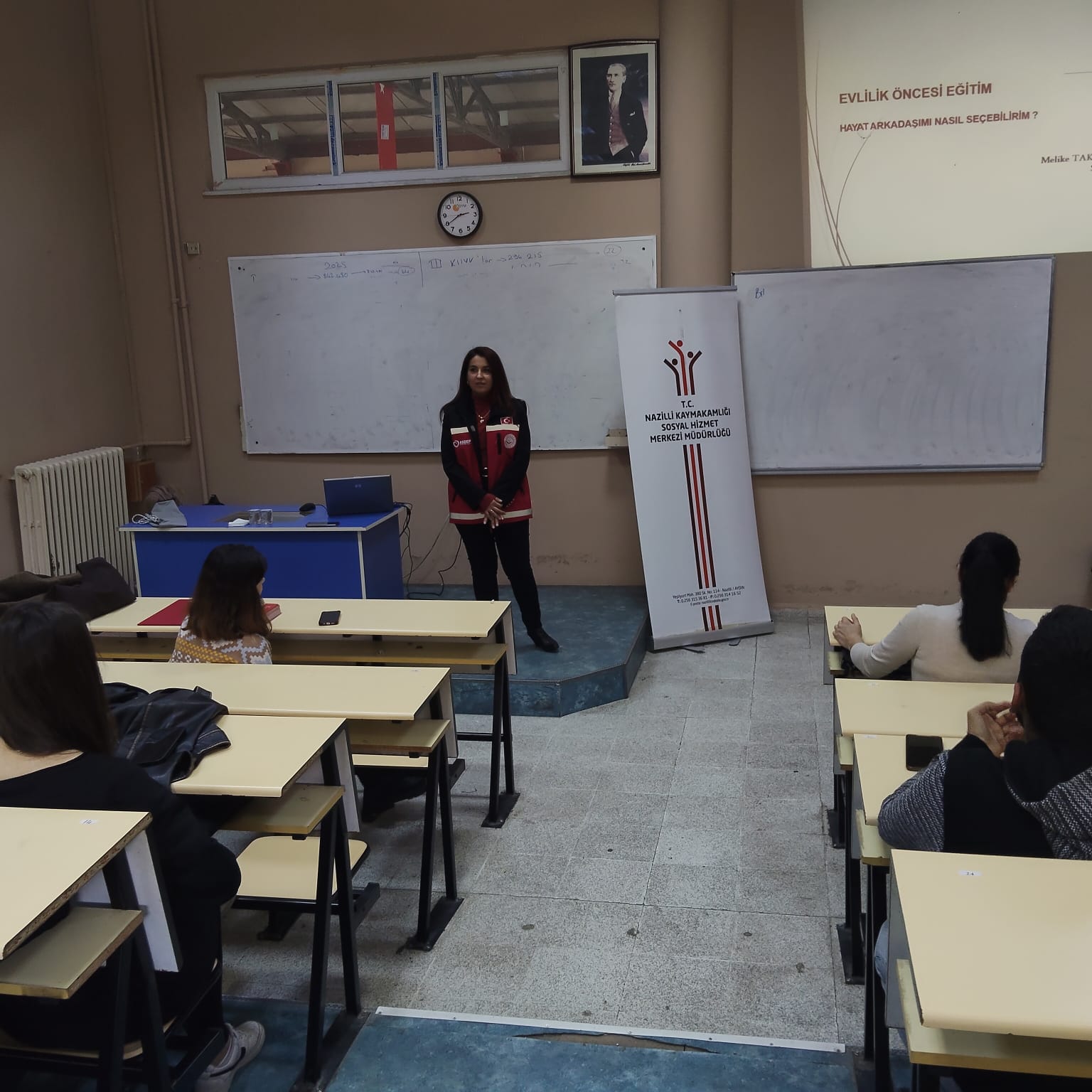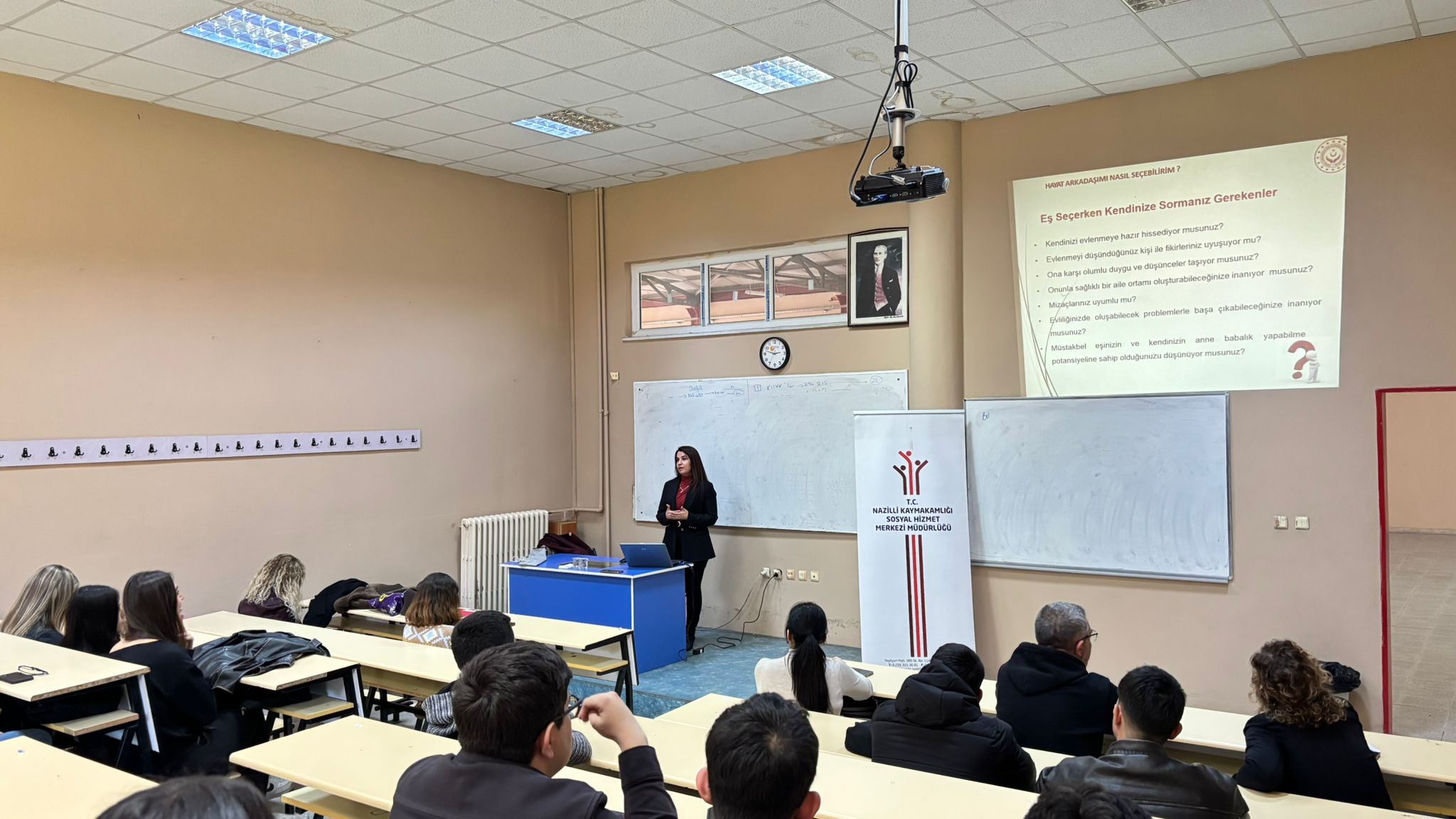 Nazilli Meslek Yüksekokulu’nda 25 Åžubat 2026 tarihinde “Evlilik Öncesi ve Aile İçi İletiÅŸim” konulu bir seminer düzenlendi. Nazilli Aile ve Sosyal Hizmetler MüdürlüÄŸü’nde görev yapan Sosyolog Melike TAKURÇAL tarafından verilen seminere Bankacılık ve Sigortacılık, Dış Ticaret, İşletme Yönetimi ve Lojistik programı 1. sınıf öÄŸrencileri katıldı.