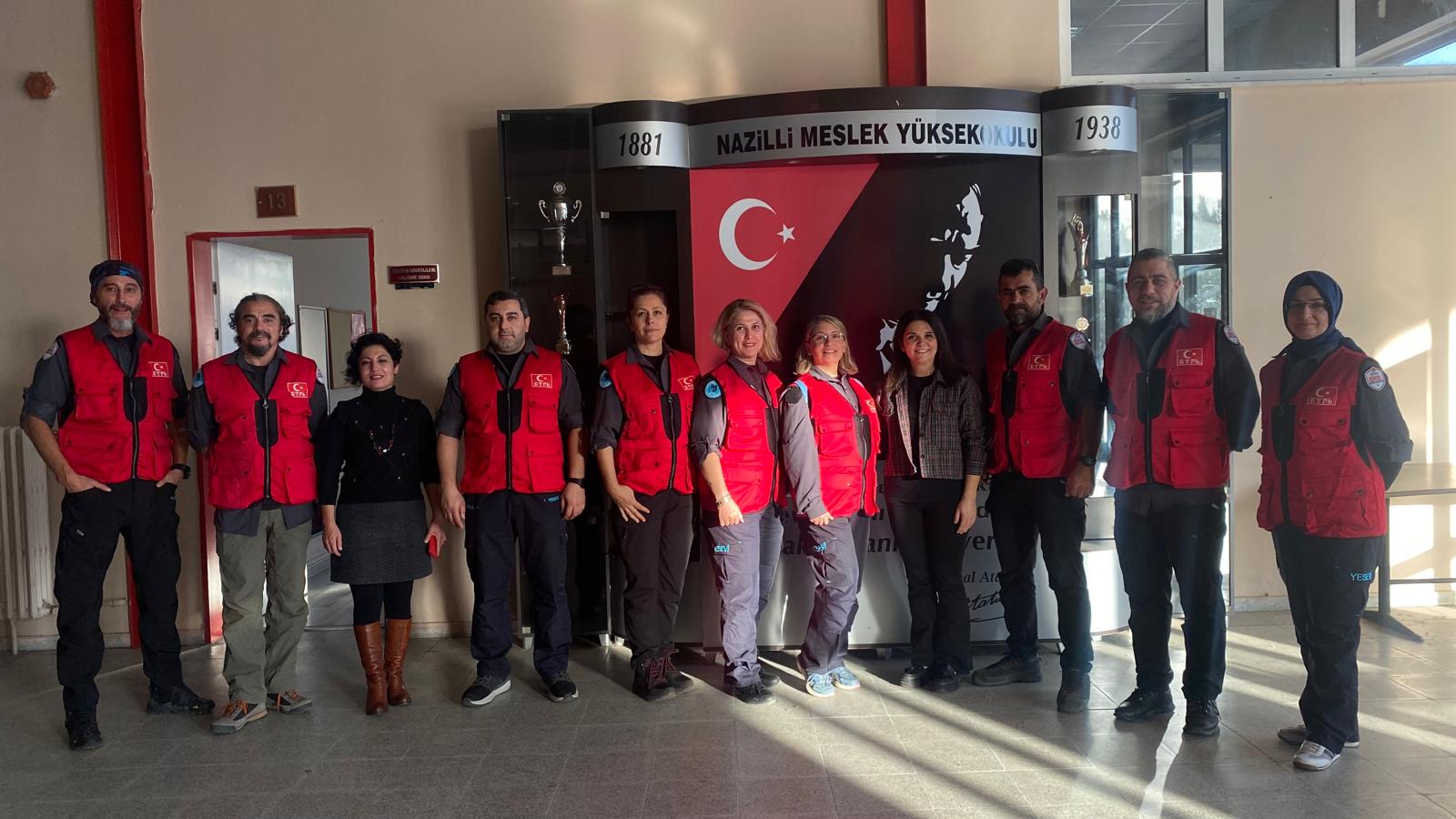 AFAD Nazilli Arama Kurtarma Ekibi ve Nazilli Bisiklet ve DoÄŸa Sporları Kulübünün (NAZBİDOS) 14 Kasım 2024 tarihinde Nazilli Meslek Yüksekokulu (MYO) dersliklerinde gerçekleÅŸtirdikleri etkinlikte öÄŸrencilere; arama kurtarma, afet bilinci ve ilk yardım konularında bilgi verildi. AFAD Arama Kurtarma EÄŸitmeni Özgür Özkan ve Nazilli Arama Kurtarma Ekip üyelerinin katılımıyla gerçekleÅŸen etkinlik kapsamında, ilk yardım ve arama kurtarmada kullanılan ekipmanların tanıtımı da yapıldı.