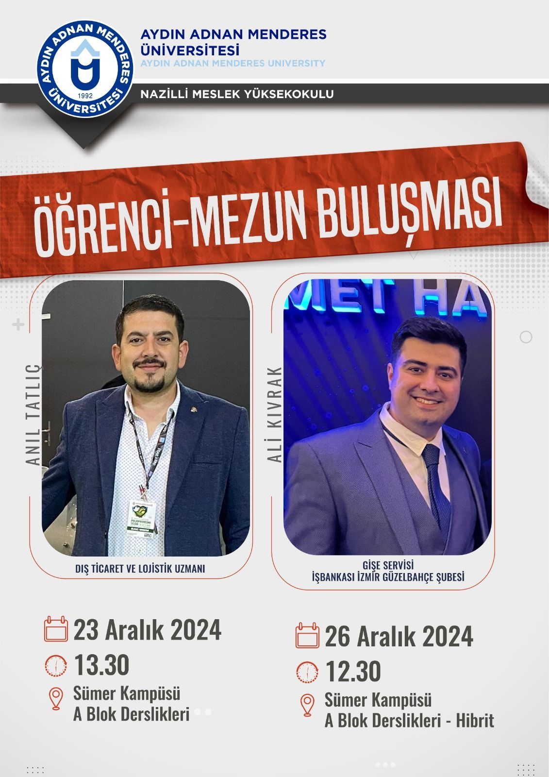 İlk etkinlik, 23 Aralık 2024 Pazartesi günü Nazilli Meslek Yüksekokulu Lojistik Programı mezunlarından EYS Endüstri Makina Sanayi ve Ticaret Anonim Åžirketi Dış Ticaret ve Lojistik Uzman Anıl TATLIÇ'ın katılımıyla gerçekleÅŸtirildi. İkinci etkinlik ise, 26 Aralık 2024 PerÅŸembe günü Dış Ticaret mezunlardan İş Bankası GiÅŸe Servis Görevlisi Ali KIVRAK'ın katılımıyla çevrim içi olarak gerçekleÅŸtirildi. ÖÄŸrencilerin ve akademik personelin katıldığı etkinlikte, mezunlarımız öÄŸrencilerle kariyer yolculuÄŸunu ve sektörel deneyimlerini paylaÅŸtı.