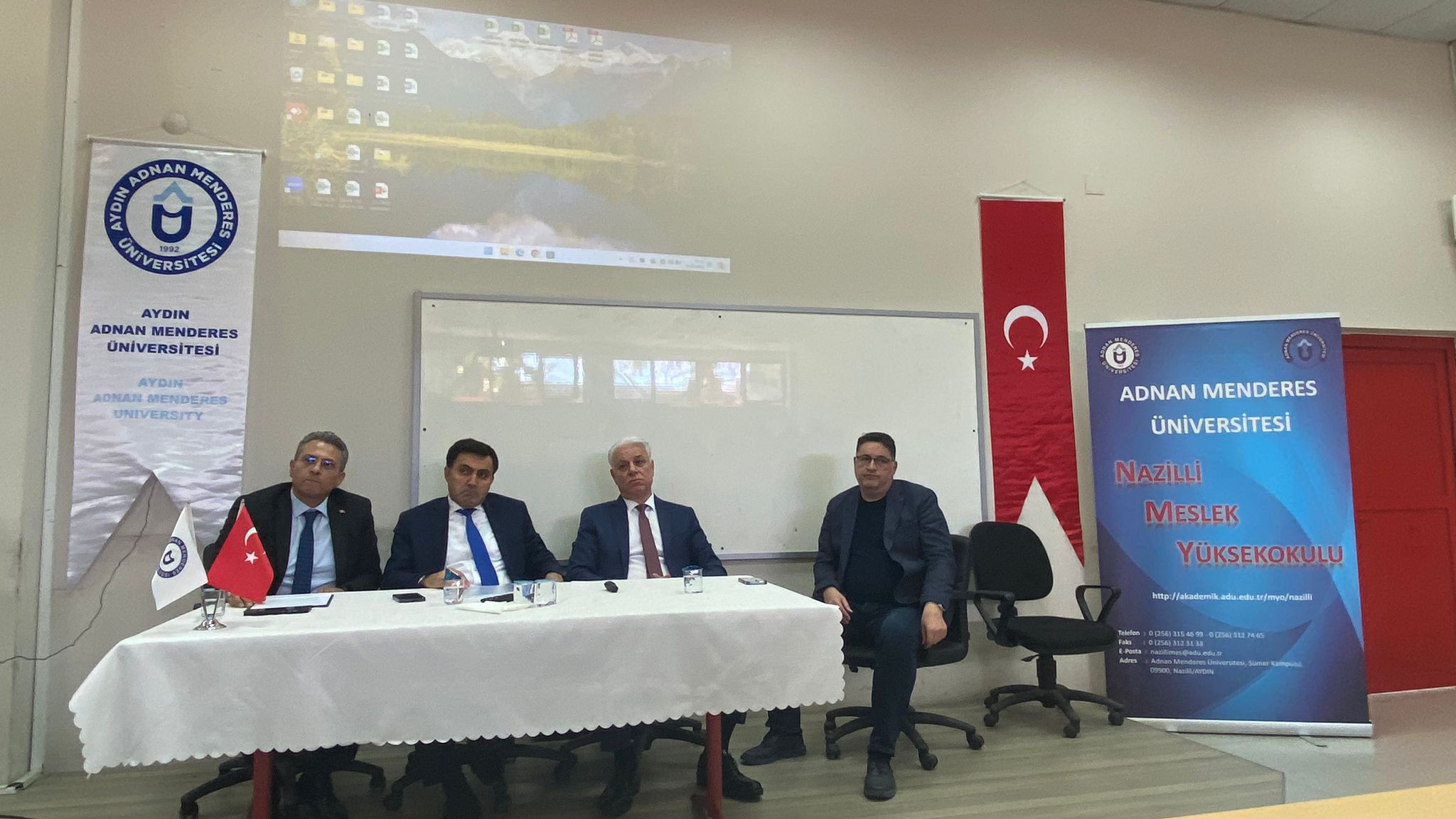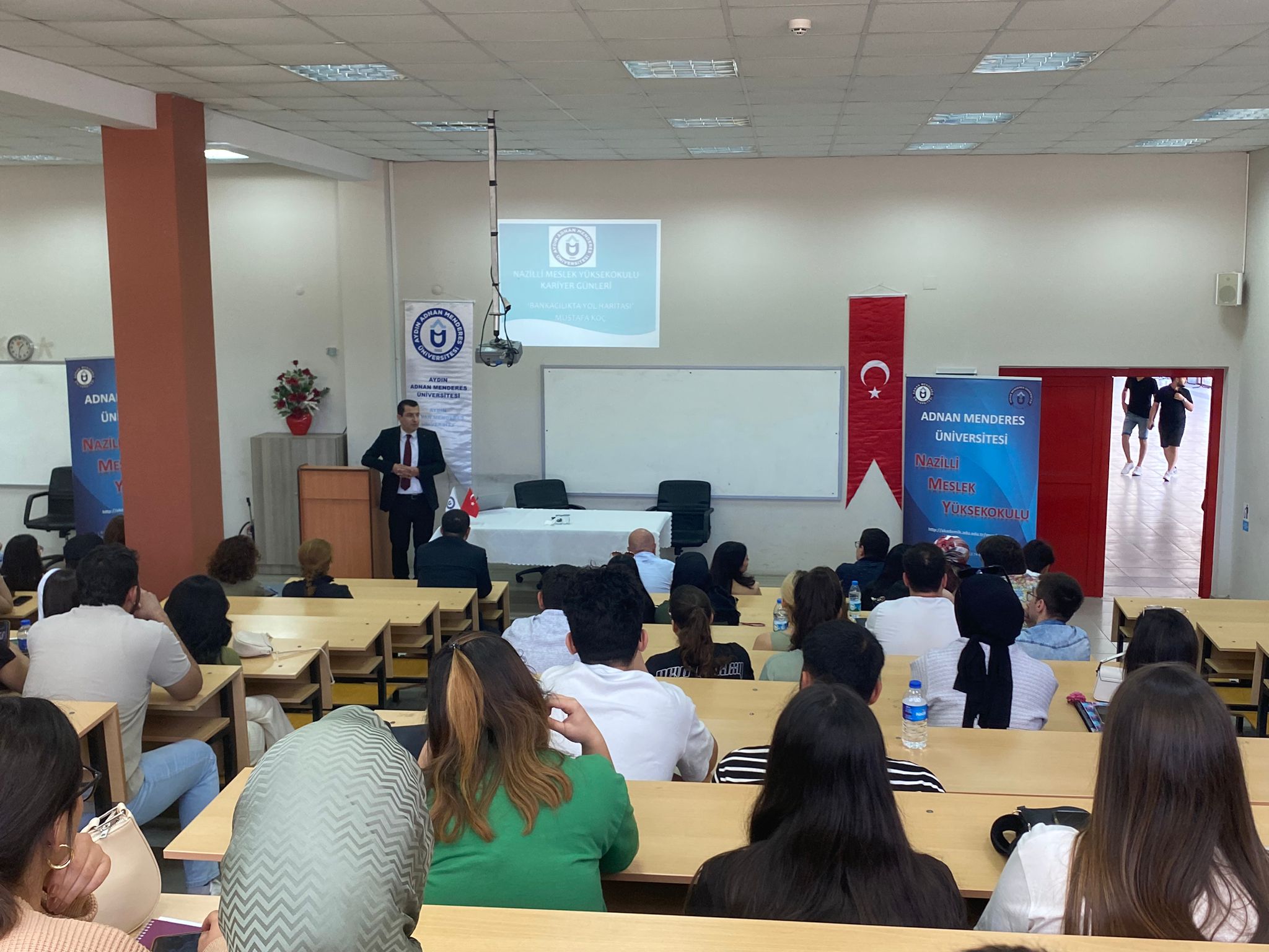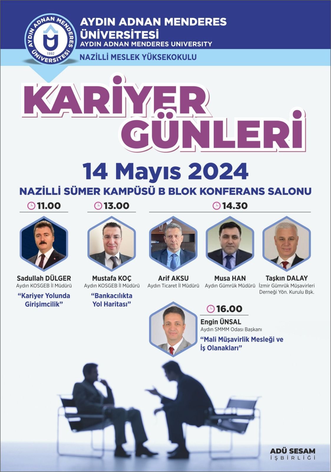Aydın Adnan Menderes Üniversitesi Nazilli Meslek Yüksekokulu tarafından 4 farklı oturumda düzenlenen “Kariyer Günleri” etkinliÄŸinin konukları; KOSGEB Aydın İl Müdürü Sadullah DÜLGER, Halkbank Nazilli Sanayi Åžube Yönetmeni Mustafa KOÇ, Aydın Ticaret İl Müdürü Arif AKSU, Aydın Gümrük İl Müdürü Musa HAN, İzmir Gümrük MüÅŸavirleri DerneÄŸi Yönetim Kurulu BaÅŸkanı TaÅŸkın DALAY, Yönetim Kurulu BaÅŸkan Vekili Nihat KOBAÅž, YetkilendirilmiÅŸ Gümrük MüÅŸaviri Ümit ÖZGÖREN, Gümrük Åžefi Hülya ARICI ve Aydın Serbest Muhasebeci ve Mali MüÅŸavirler Odası BaÅŸkanı Engin ÜNSAL’dı.