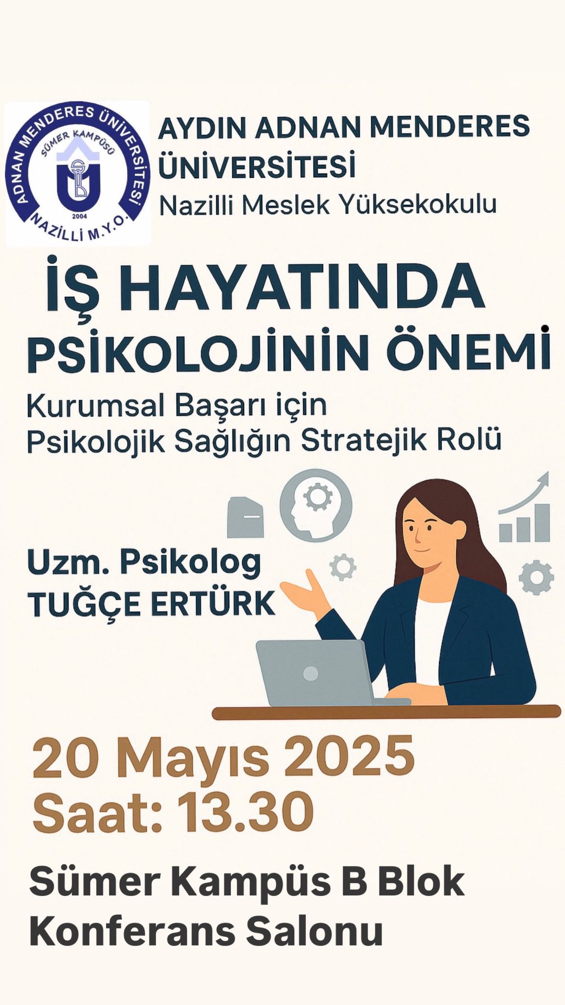 Nazilli Meslek Yüksekokulunda, 20 Mayıs 2025 tarihinde Uzman Psikolog Tuğçe Ertürk’ün konuşmacı olarak katıldığı “İş Hayatında Psikolojinin Önemi: Kurumsal Başarı İçin Psikolojik Sağlığın Stratejik Rolü” başlıklı etkinlik düzenlendi. Etkinlikte, çalışma yaşamının farklı aşamalarında karşılaşılabilecek psikolojik zorluklar ve bu zorluklarla başa çıkmada etkili olabilecek yöntemler ele alındı. İş yaşamında sıkça karşılaşılan stres, tükenmişlik ve benzeri psikolojik sorunlara yönelik stratejiler hakkında öğrencilere kapsamlı bilgiler sunuldu. Ayrıca, bağımlılıkla mücadele konusunda da farkındalık oluşturulmasına yönelik bilgiler paylaşıldı.