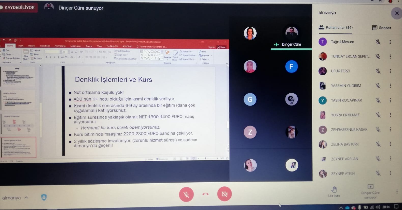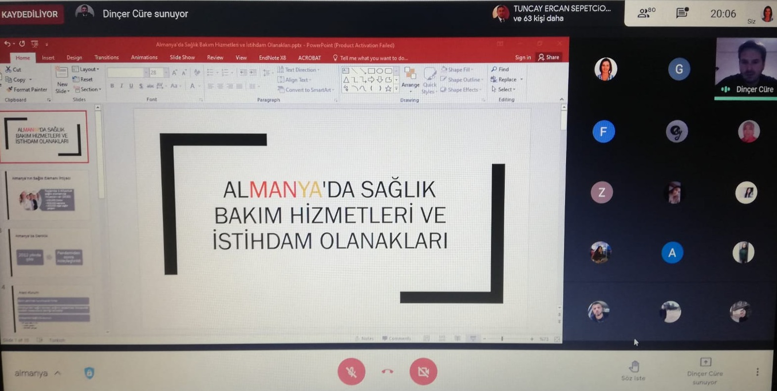 Nazilli Sağlık Hizmetleri Meslek Yüksekokulu bünyesinde mezun durumdaki öğrencilere yönelik "Almanya'da Sağlık Bakım Hizmetleri ve İstihdam Olanakları" konulu kariyer geliştirme toplantısı düzenlendi. Toplantı 30.03.2021 tarihinde “Google Meet” uygulaması üzerinden çevrimiçi (online) olarak gerçekleştirildi. Toplantıya Meslek Yüksekokulu Müdürü Doç. Dr. Tuncay Ercan SEPETCİOĞLU, okulumuz öğretim elemanları ve öğrencileri katılım sağladı.