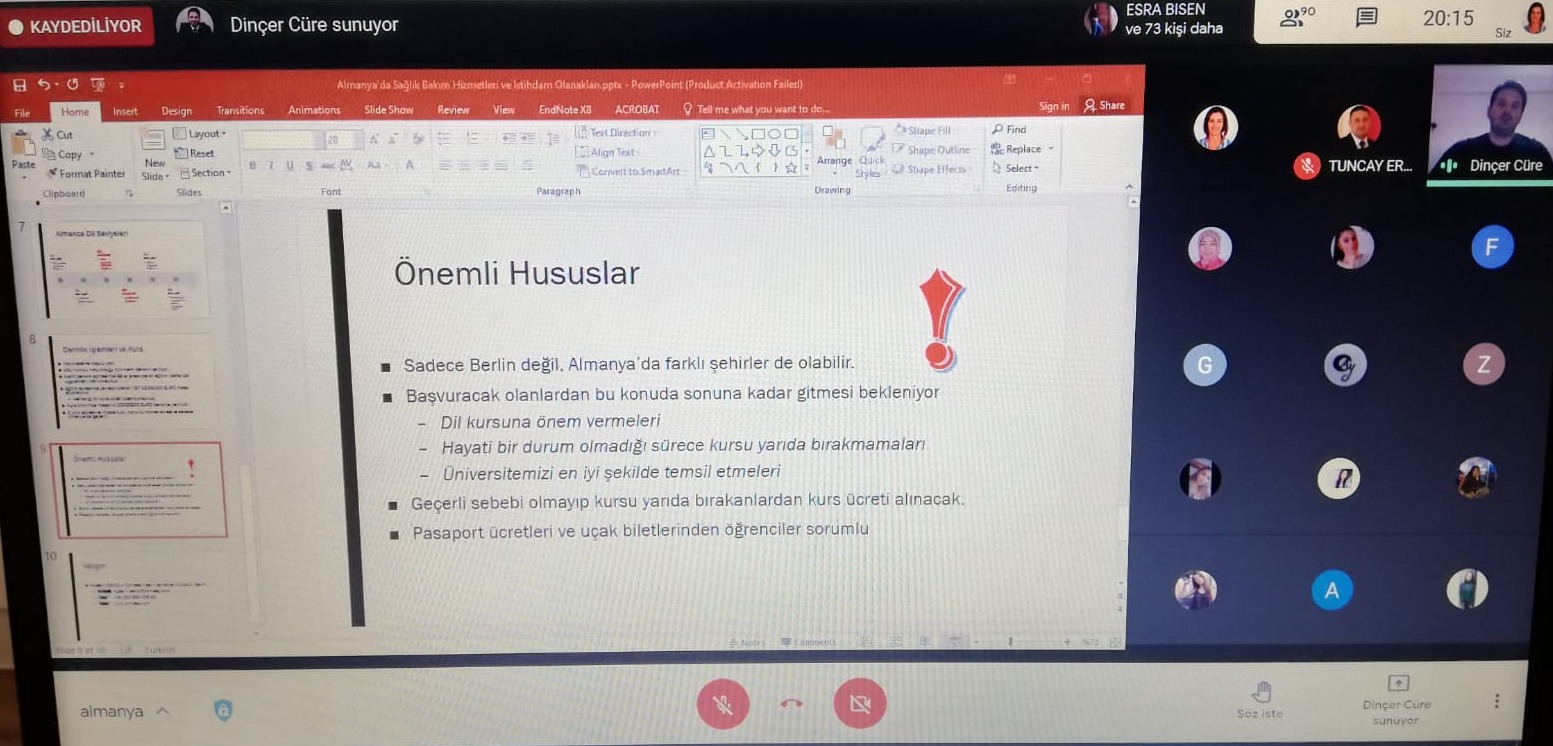 Katılımın yoğun olduğu toplantıda okulumuz öğretim elemanları Dr. Öğr. Üyesi Dinçer CÜRE ve Öğr. Gör. Gülşah Şükran KALE tarafından Almanya'da Sağlık Bakım Hizmetleri alanında çalışmayı düşünen öğrencilerimiz için izlenecek başvuru süreci, denklik işlemleri ve yabancı dil kursu ile ilgili bilgi verildi.