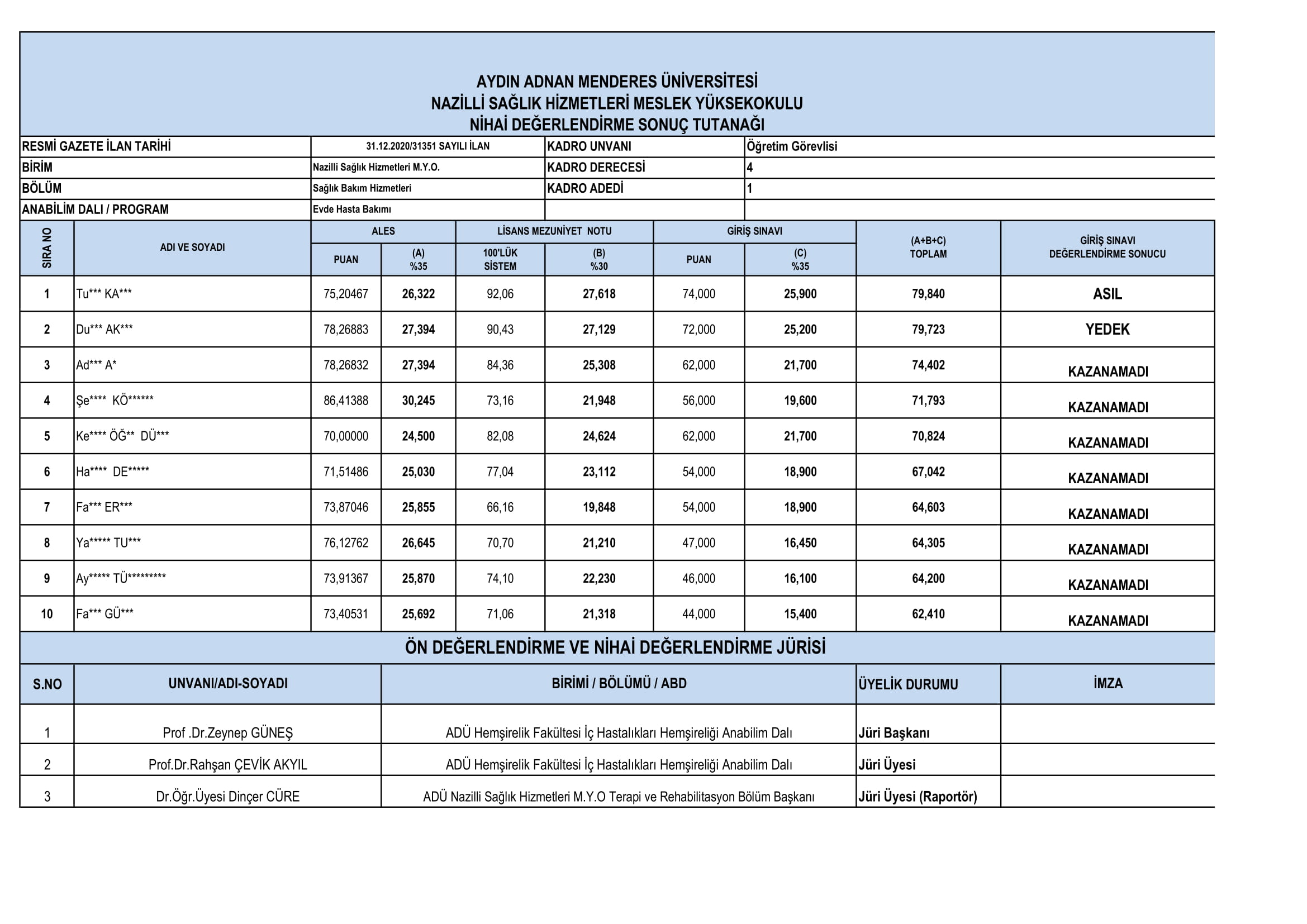 EVDE HASTA BAKIM PROGRAMI ÖĞRETİM GÖREVLİSİ NİHAİ DEĞERLENDİRME SONUCU