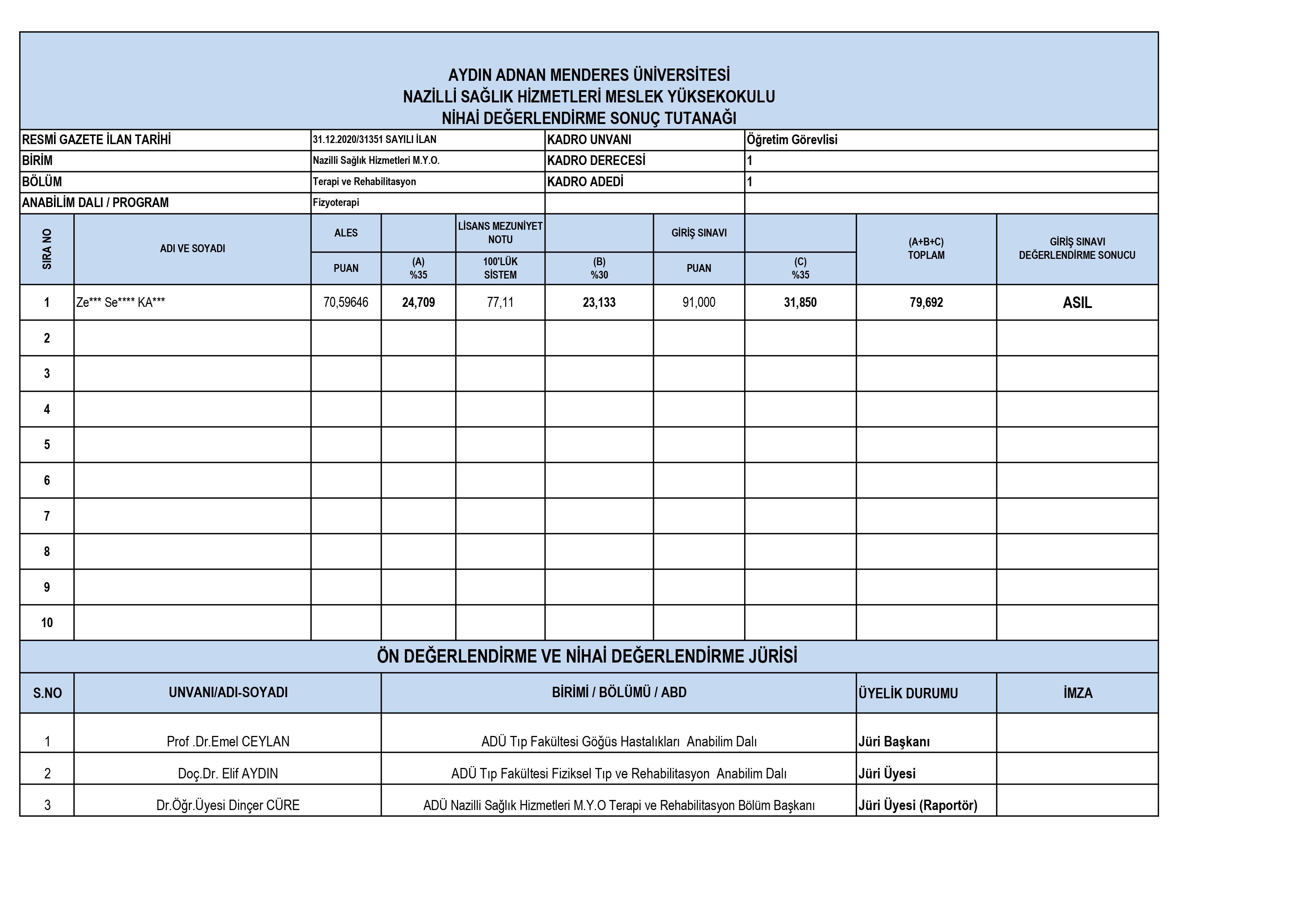 FİZYOTERAPİ PROGRAMI 1. DERECE ÖĞRETİM GÖREVLİSİ NİHAİ DEĞERLENDİRME SONUCU